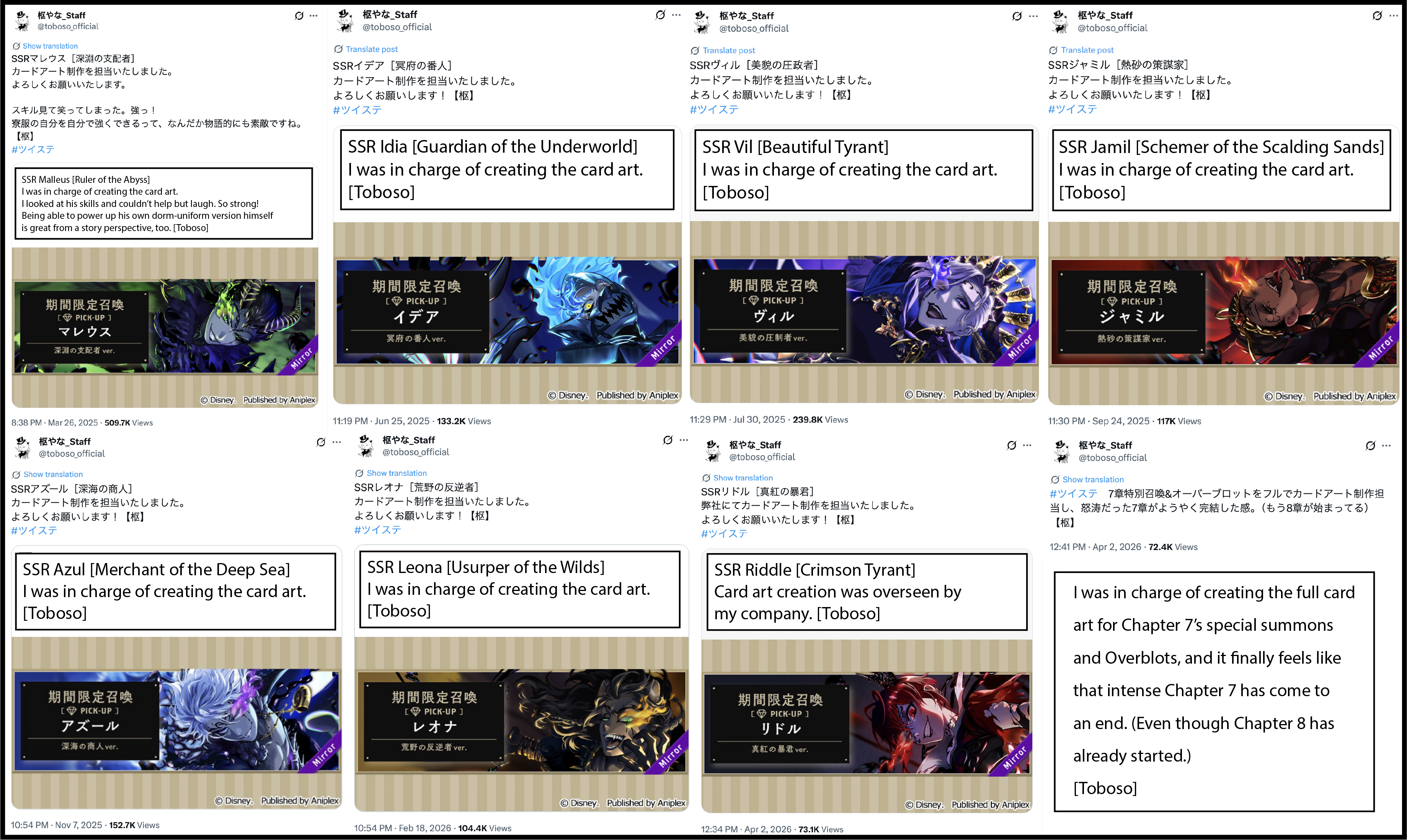 I was in charge of creating the full card art for Chapter 7’s special summons and Overblots, and it finally feels like that intense Chapter 7 has come to an end. (Even though Chapter 8 has already started.) [Toboso] (source)