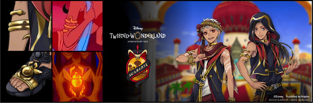 “Arabia and dancing are the themes of these dorm uniforms. We designed a large hood in the image of the hooded cobra that Jafar transforms into. When we added Aladdin-like sarouel pants the silhouette became reminiscent of street fashion, so we added bandanas, belts, sneaker-sandals, etc. to create a look similar to dancewear. The gold accessories and clothing patterns include snake motifs, scarabs and architectural designs based on Agrabah from the original movie.”