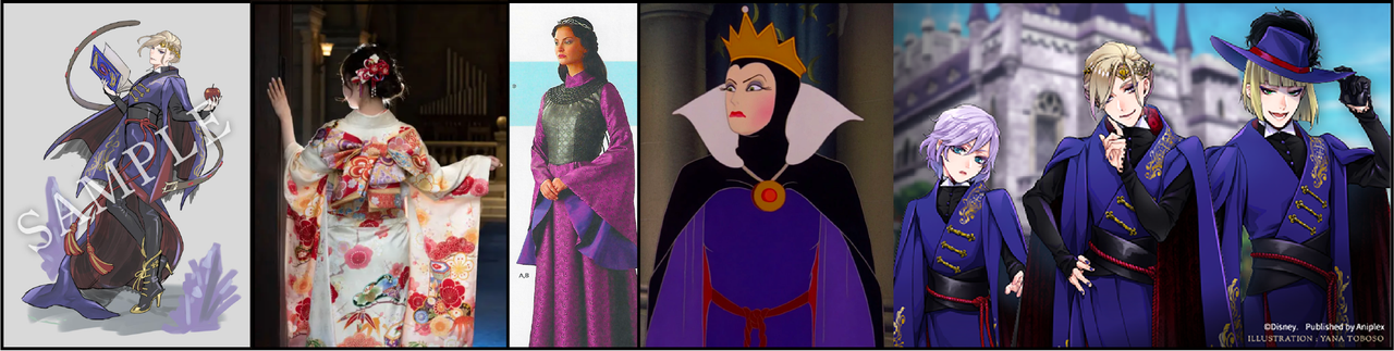 “Tradition and poison are the themes of these dorm uniforms. Pomefiore was the most difficult to design. The evil queen’s original dress is very simple. The more detailed I made the design, the weaker the connection to the queen became. During a lot of trial and error, I was making rough sketches based on a medieval dress design, and one of the Disney artists who saw it complimented and said, ‘It looks like a kimono—it’s so innovative. It’s great’.