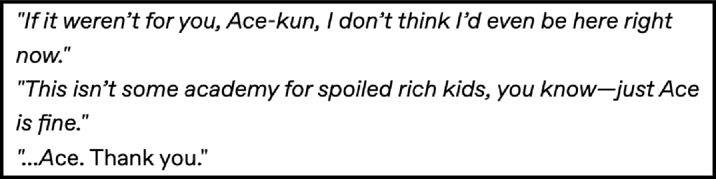 In the novels, for example, prefect character Kuroki Yuuya refers to Ace as “Ace-kun” from pages 97 to 179, at which point Ace himself finally says “Just call me Ace”, as Yuuya refuses to make the jump for himself. Yuuya does so for the first time on page 181, while in narration it is explained, “Yobi-sute was a little awkward, but Ace didn’t seem to mind at all. In fact, he looked refreshed.”