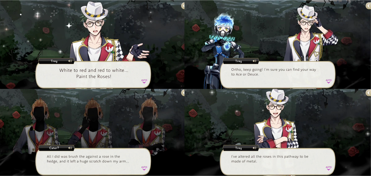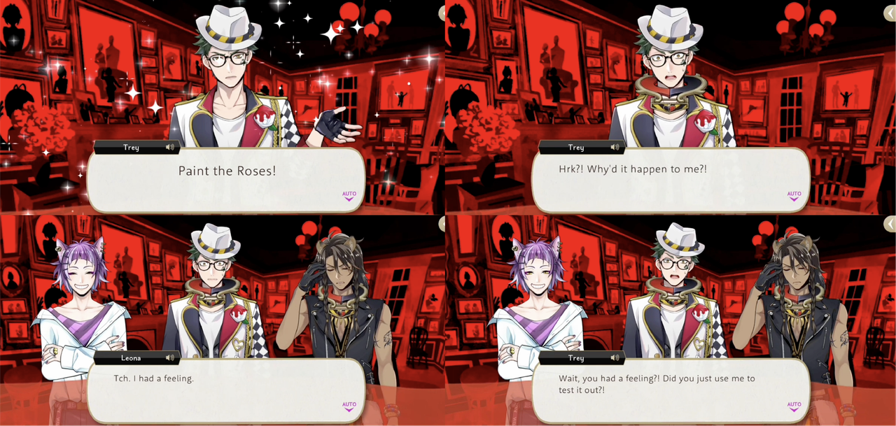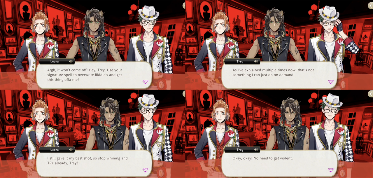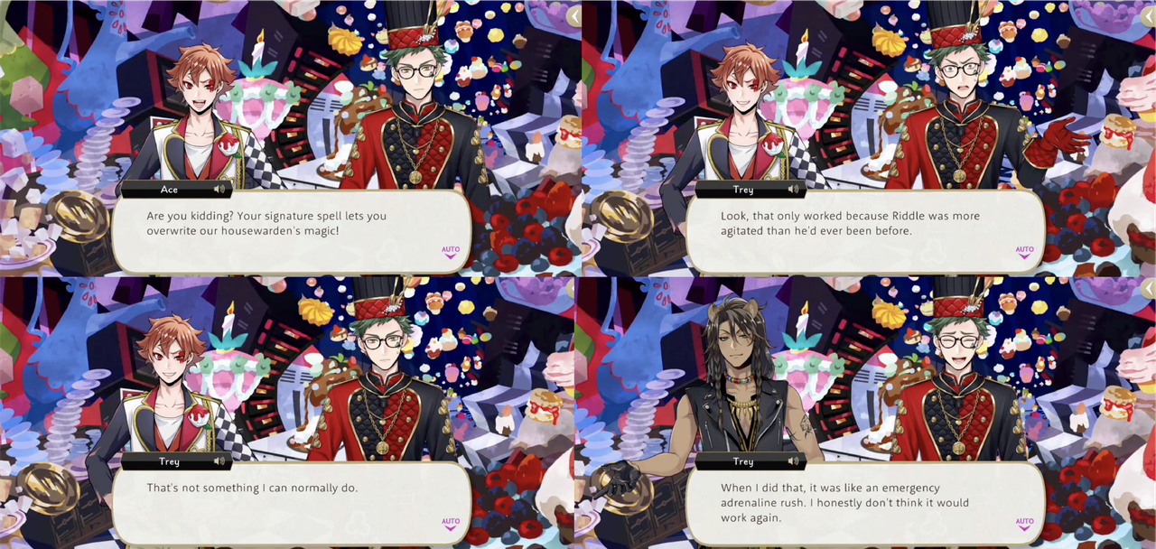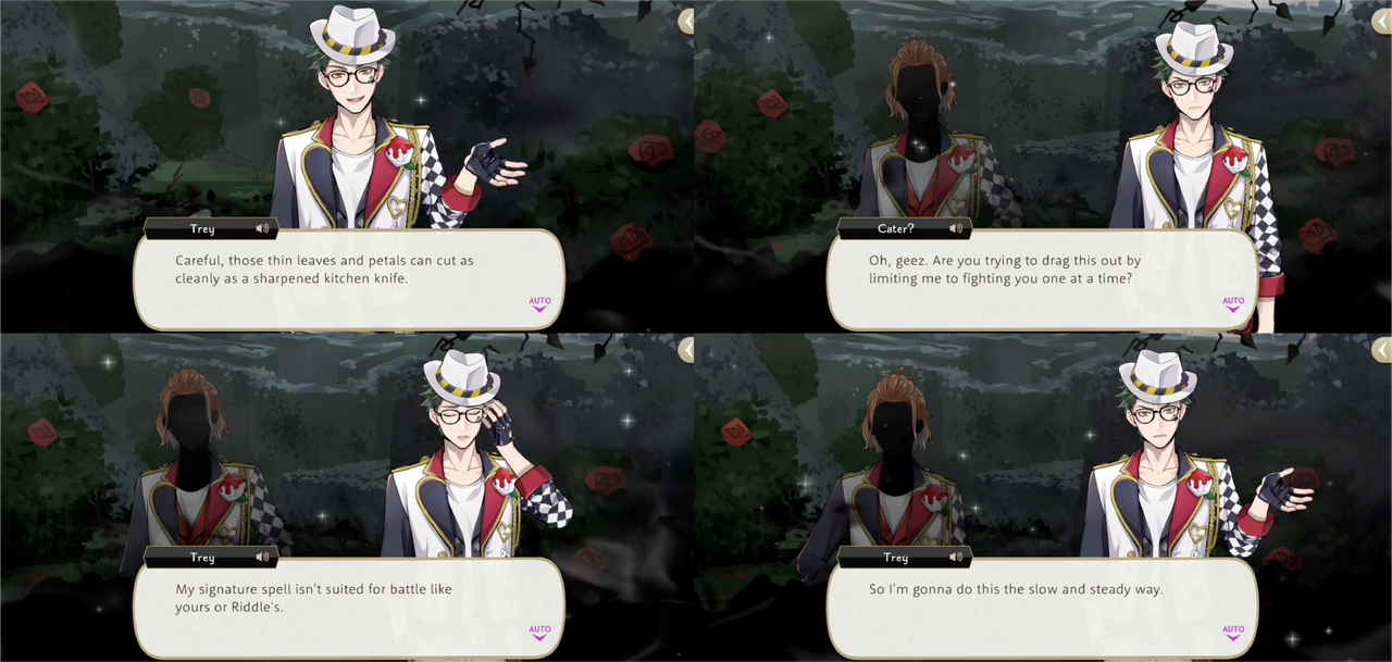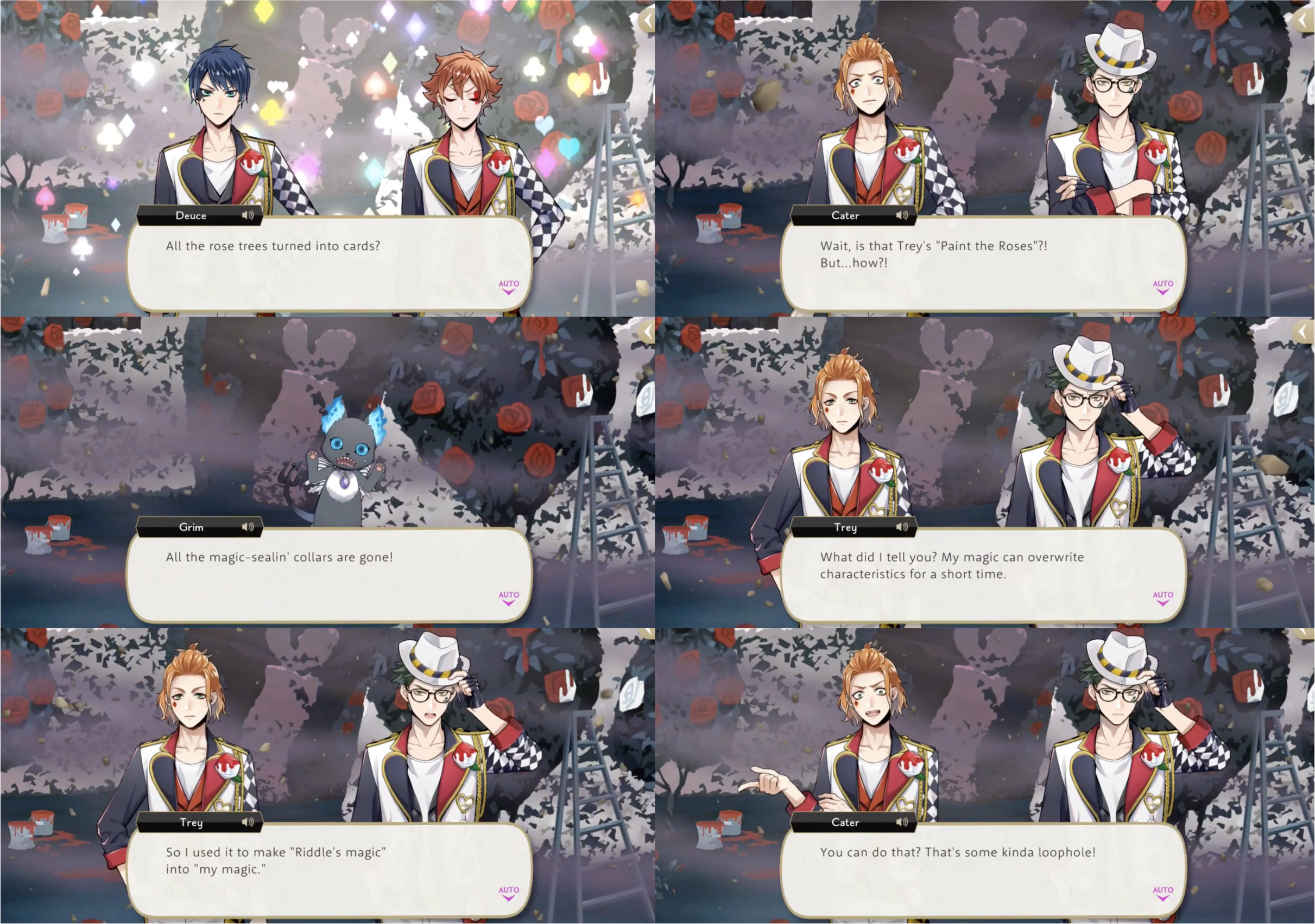 Later we learn that Trey may have been intentionally downplaying his own ability: when he overwrites an overblotting Riddle’s magic, turning murderous rose trees into playing cards and dissolving the collars made from Riddle’s own unique magic, he surprises everyone including Riddle and Cater.