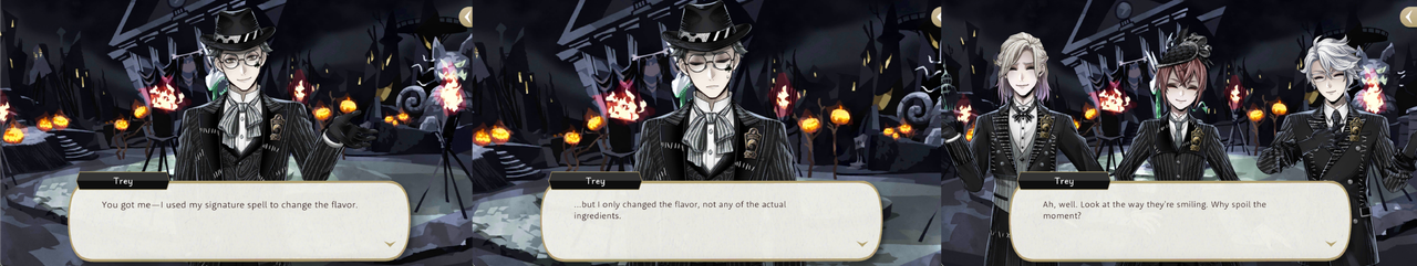Trey also uses his unique magic during the Nightmare Before Christmas event to make a soup more palatable. Trey quietly reflects, “..but I only changed the flavor, not any of the actual ingredients. Ah, well. Look at the way they’re smiling. Why spoil the moment?”