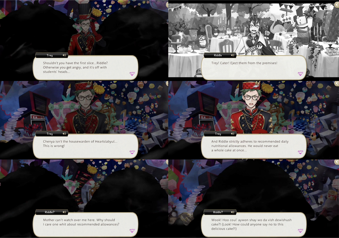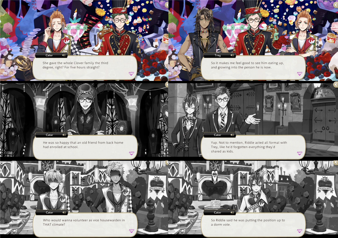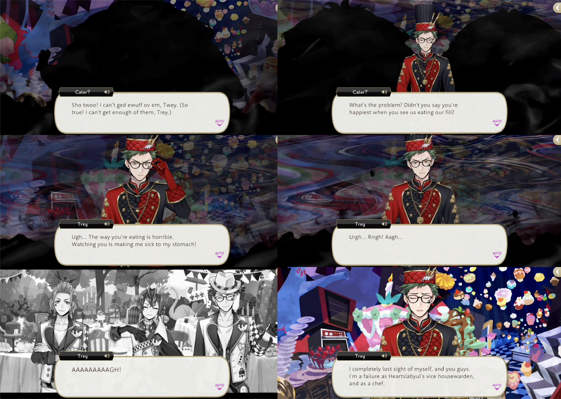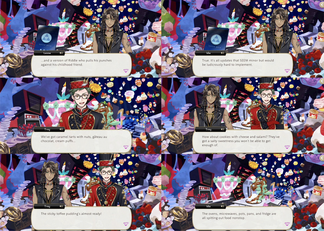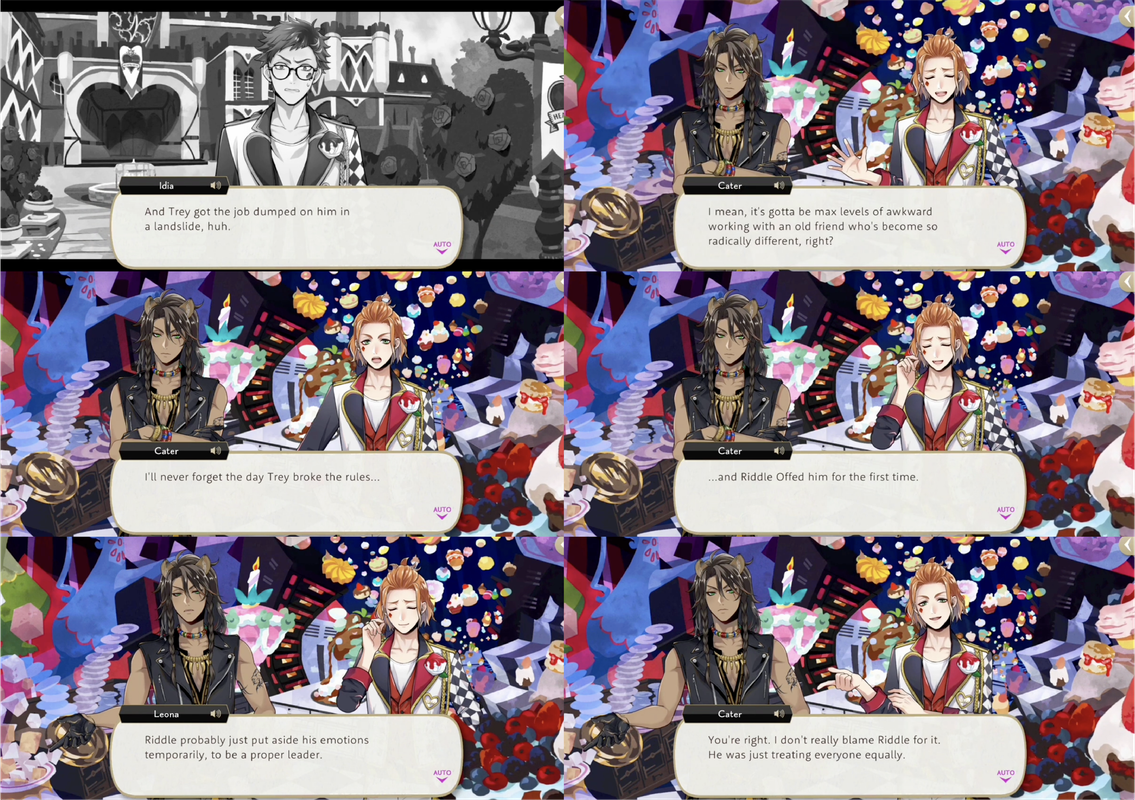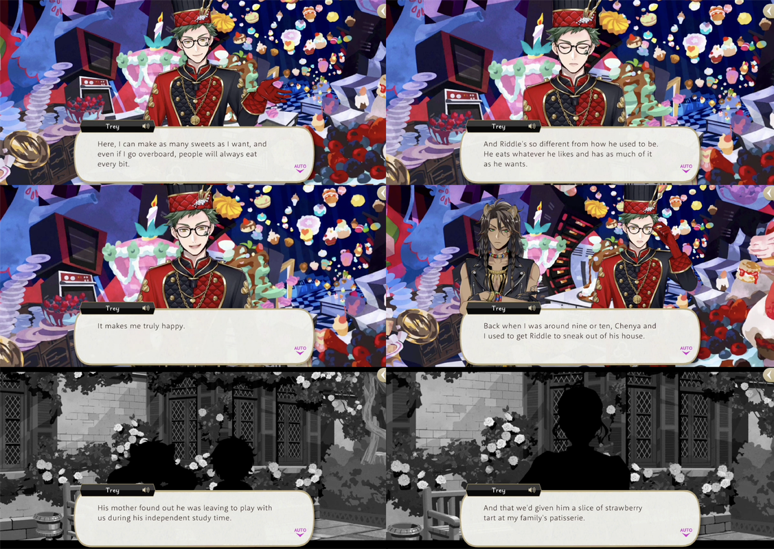 Leona asks for details and Trey tells him about how he and Chenya used to sneak Riddle out of his house to play when they were children, and when his mother found out that they’d given him a slice of strawberry tart she lectured Trey’s entire family for five hours straight. Trey says, “it makes me feel good to see him eating up, and growing into the person he is now.”