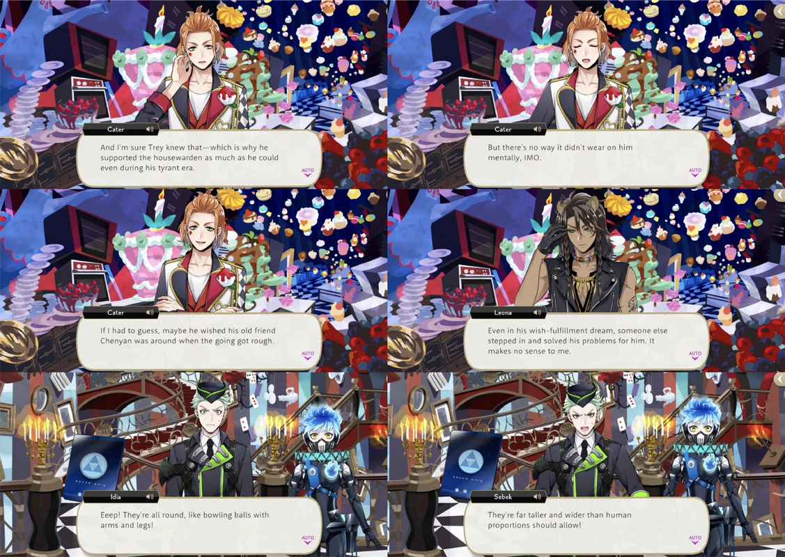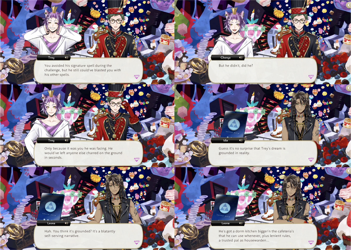 Idia calls Trey’s dream “grounded” but Leona describes it as “a blatantly self-serving narrative. He’s got a dorm kitchen bigger than the cafeteria’s that he can use whenever, plus lenient rules, a trusted pal as housewarden and a version of Riddle who pulls his punches against his childhood friend.”