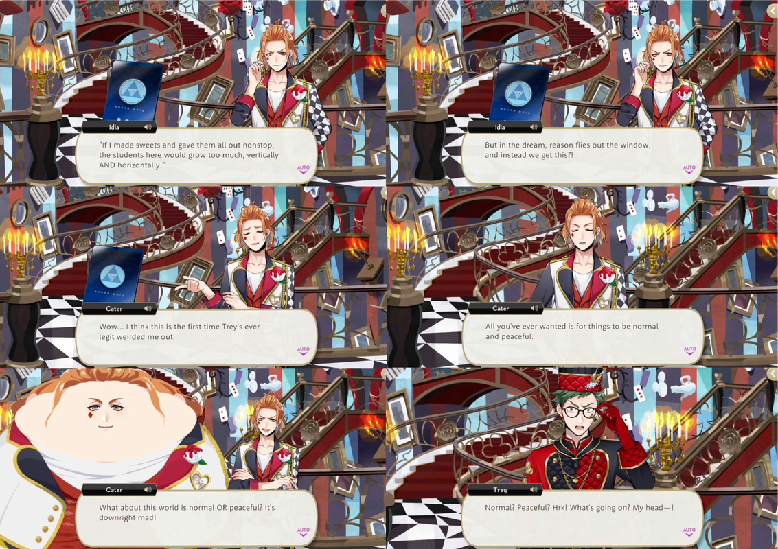 Idia follows with, “So basically, in the real world, he’s reasonable and realistic about his baking…But in the dream, reason flies out the window, and instead we get this?!,” and Cater says, “I think this is the first time Trey’s ever legit weirded me out.”