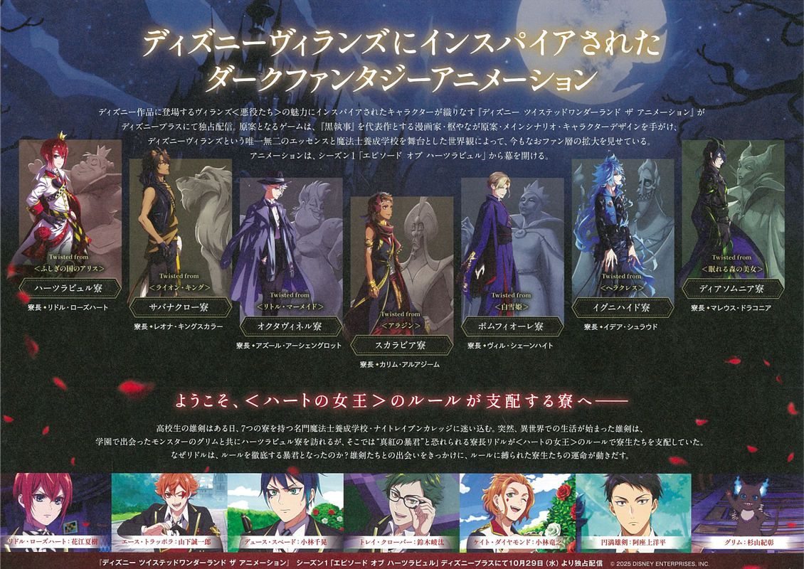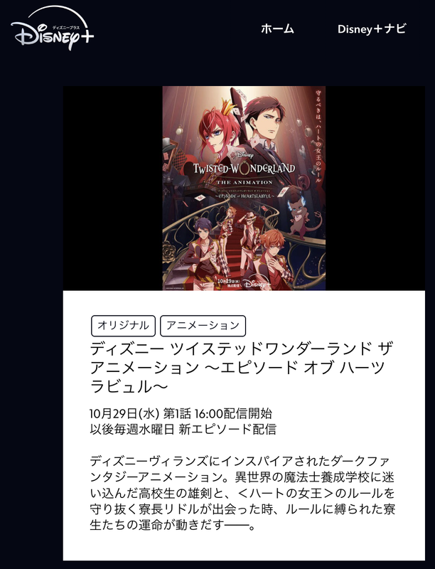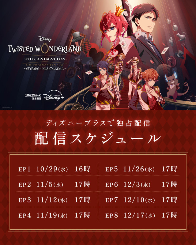 The Twisted Wonderland anime is a Disney+ exclusive project, announced for release of eight episodes, once a week every Wednesday beginning from October 29, 2025, and confirmed for three seasons.