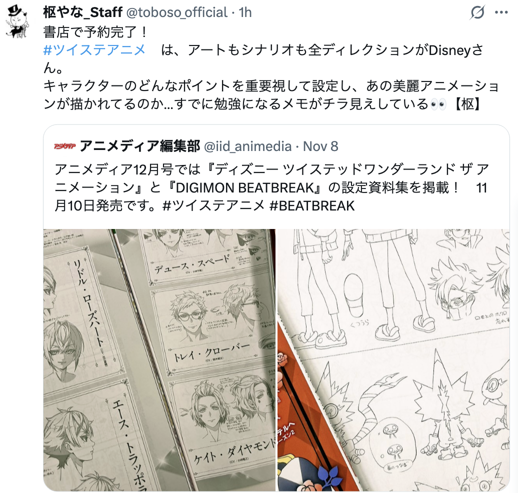 “The art, scenarios, and all direction for the Twst anime are handled by Disney. You can catch a glimpse of notes showing what points they focused on when designing the characters and drawing them so beautifully…it’s already proving educational.”【Toboso】