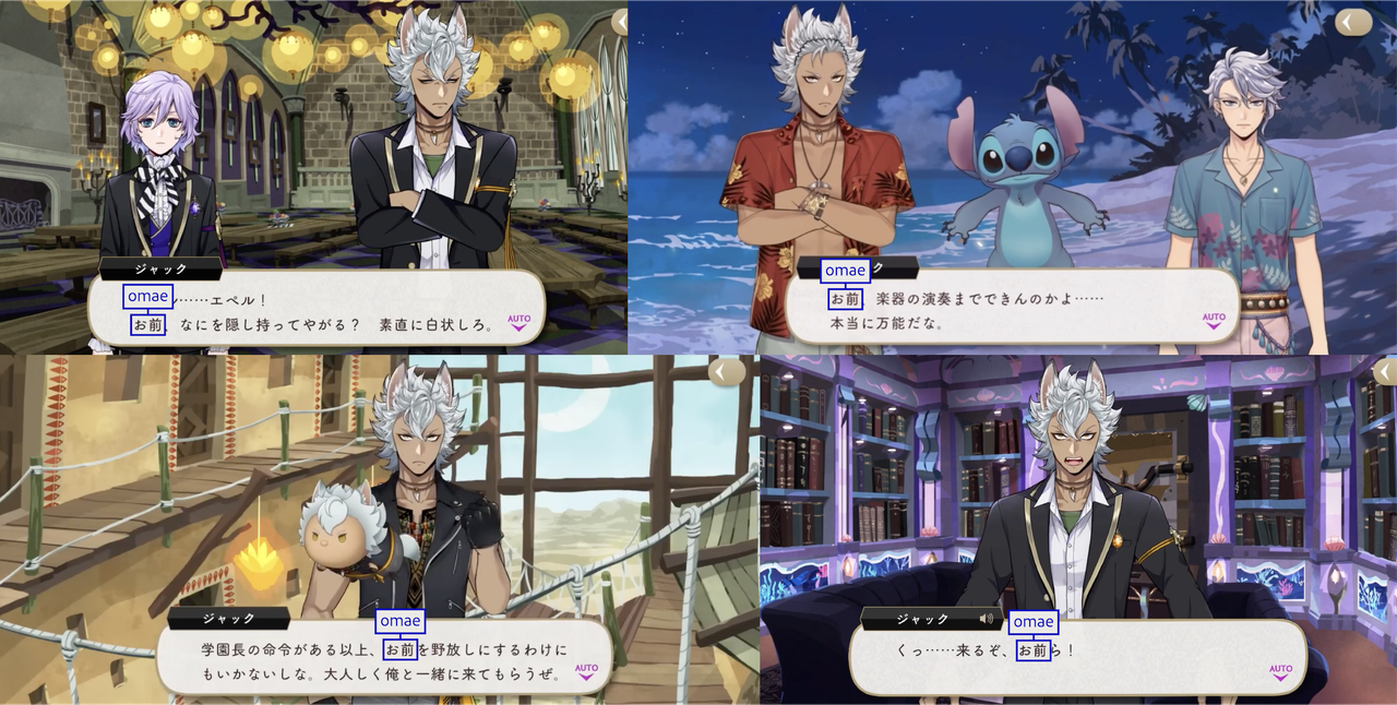 お前 (omae) is the form of you that Jack tends to use the most with other first-year students, and he additionally uses it with his tsum, Stitch, and sometimes with Octavinelle.