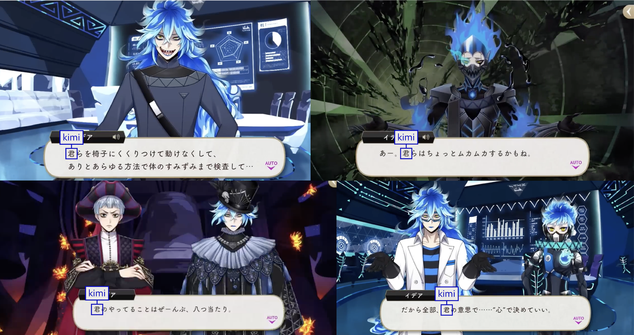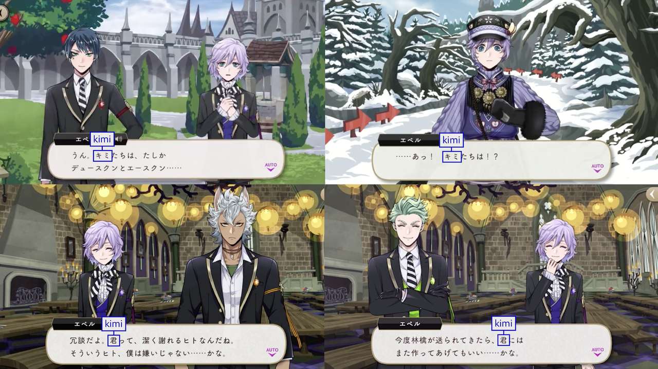 Deuce uses 君 (kimi) upon meeting Ace, Chenya, and Epel for the first time as well as three other forms of “you.”