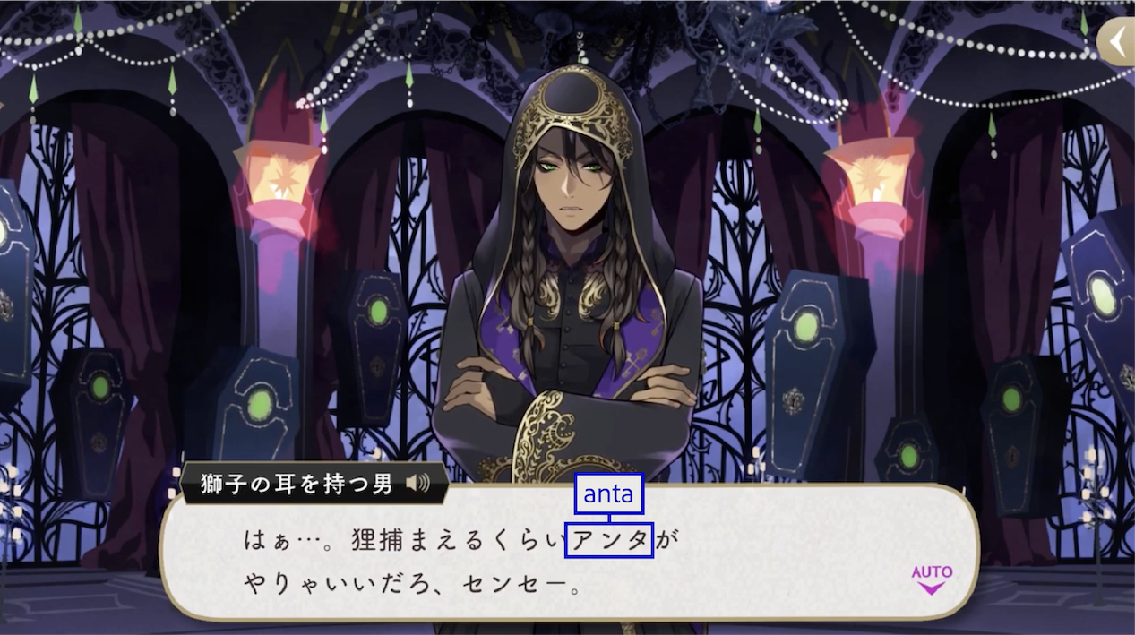 アンタ (anta) is one of Ruggie’s two preferred forms of “you,” and there’s a significant moment in Book 2 when he uses it to refer to Leona for the first time.