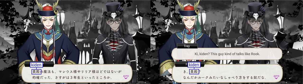 Rook uses 貴殿 (kiden) to greet the Island of Woe, and Sebek uses it when complimenting people who impress him. Trey comments that Sebek sounds like Rook.