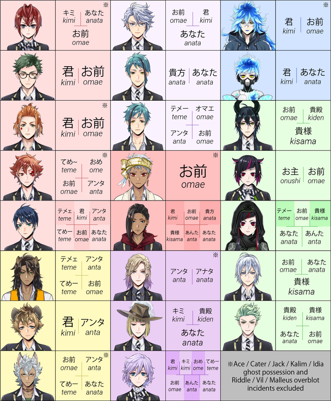 Azul uses three forms of “you” including 君 (kimi), Jamil uses 君 (kimi) plus four other forms of “you”, and it is possible that Rook uses キミ (kimi) almost exclusively (with at least two exceptions, both in Book 6).