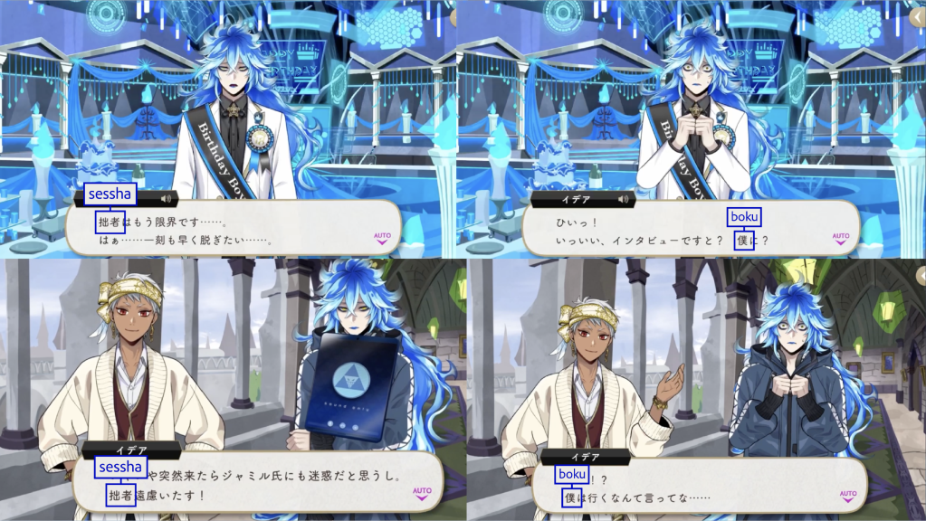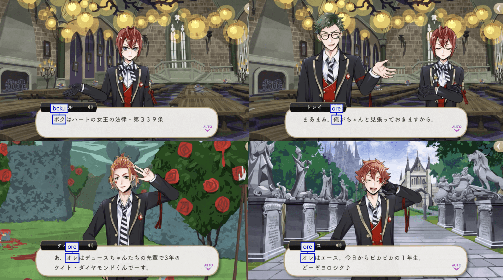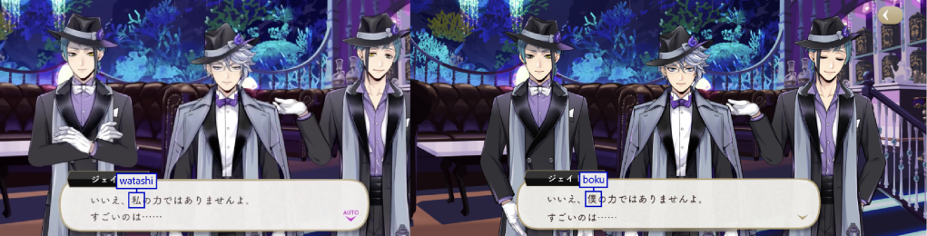 Another example of this would be Vil using “Boku” during Phantom Bride, as a part of the role he is portraying as a prince looking to win Eliza’s hand in marriage.