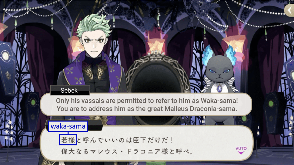 A: Malleus’ use of “Boku” may be tied to how he has yet to take on the adult responsibilities that await him in Briar Valley. Malleus is not yet a ruler, and this may be a reason his title reflects his relationship to Maleficia (Waka-sama). He has yet to become a Lord in his own right or take on the responsibilities of adulthood, which is possibly being reflected in his use of “Boku,” which is commonly associated with younger boys (though it can be used by adults in casual situations who prefer it, and it is often heard in work environments).
