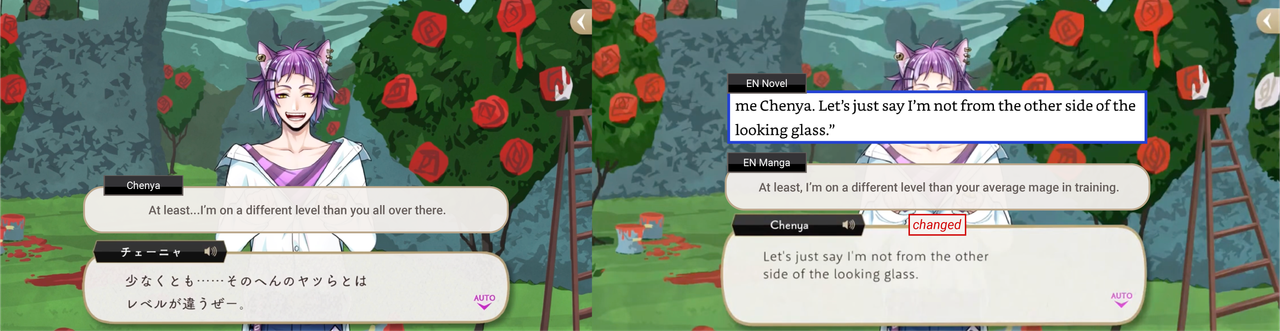 (More dialogue rewritten for the EN game that varies from both the original game and novel (EN manga is accurate).)