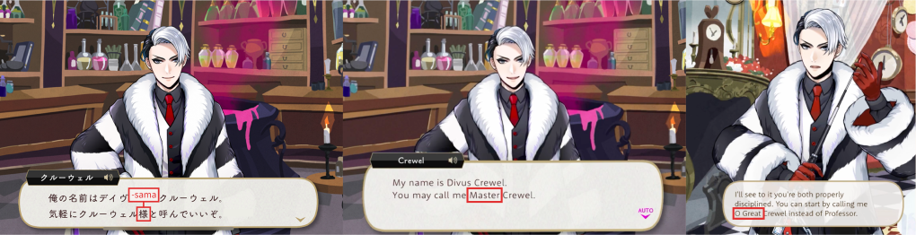 (Interestingly the “Crewel-sama” line was actually kept in the EN game, where it was localized as “Master” in one place and “O Great” in another: “You can start by calling me ‘O Great Crewel’ instead of Professor.”)