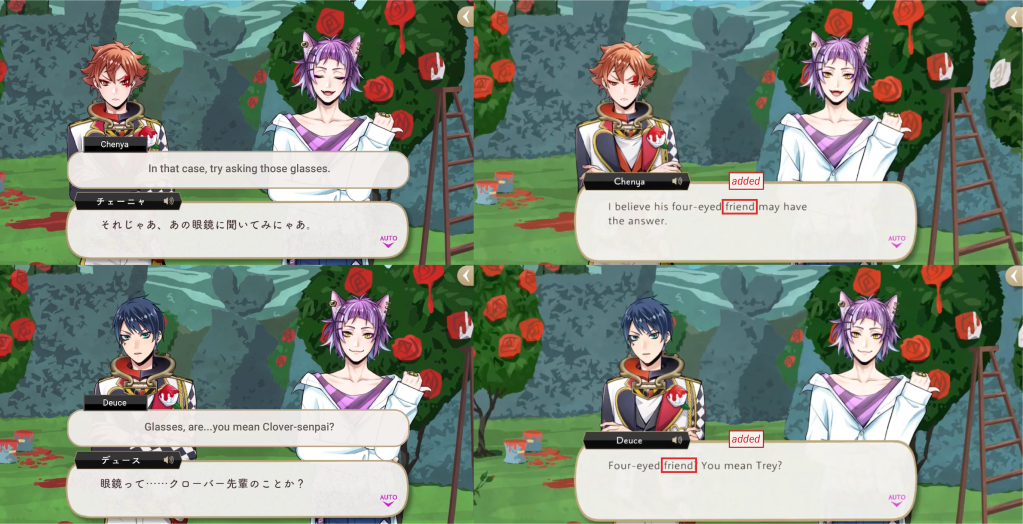 In the original novel (and game) Chenya just refers to Trey as “glasses/four-eyes,” but in the EN novel (and game) he says “four-eyed friend.”