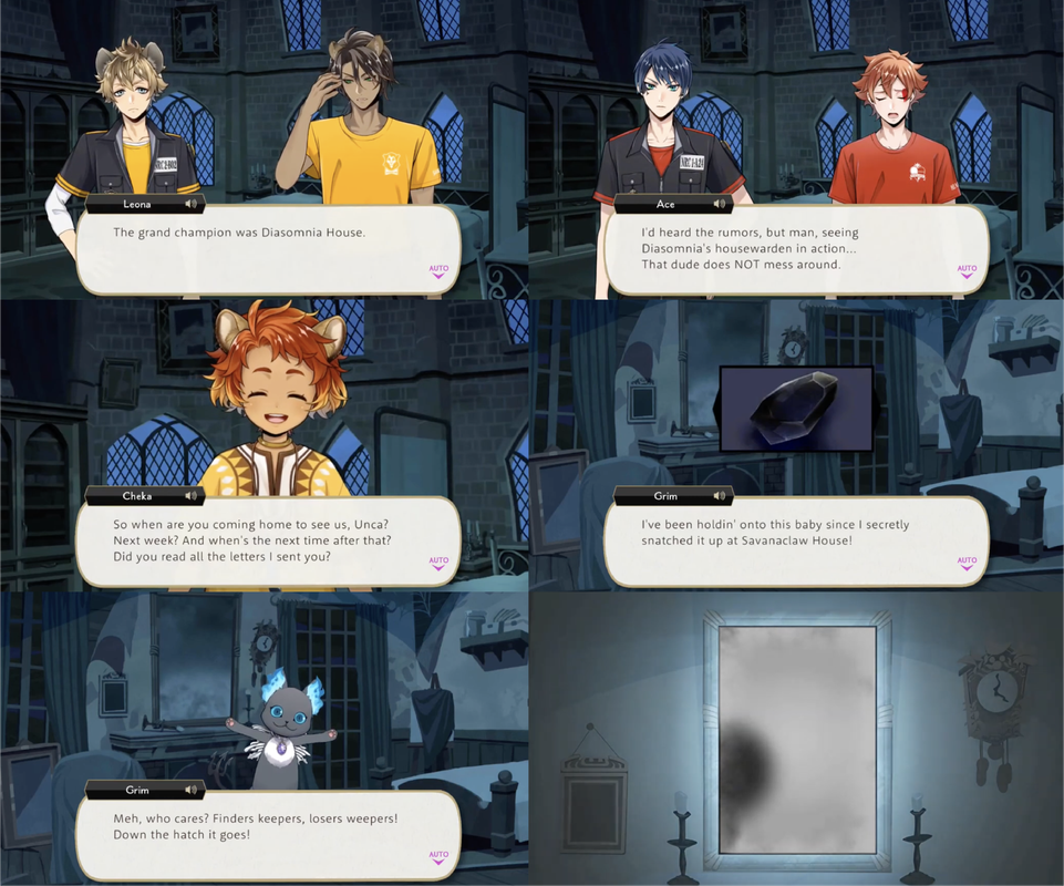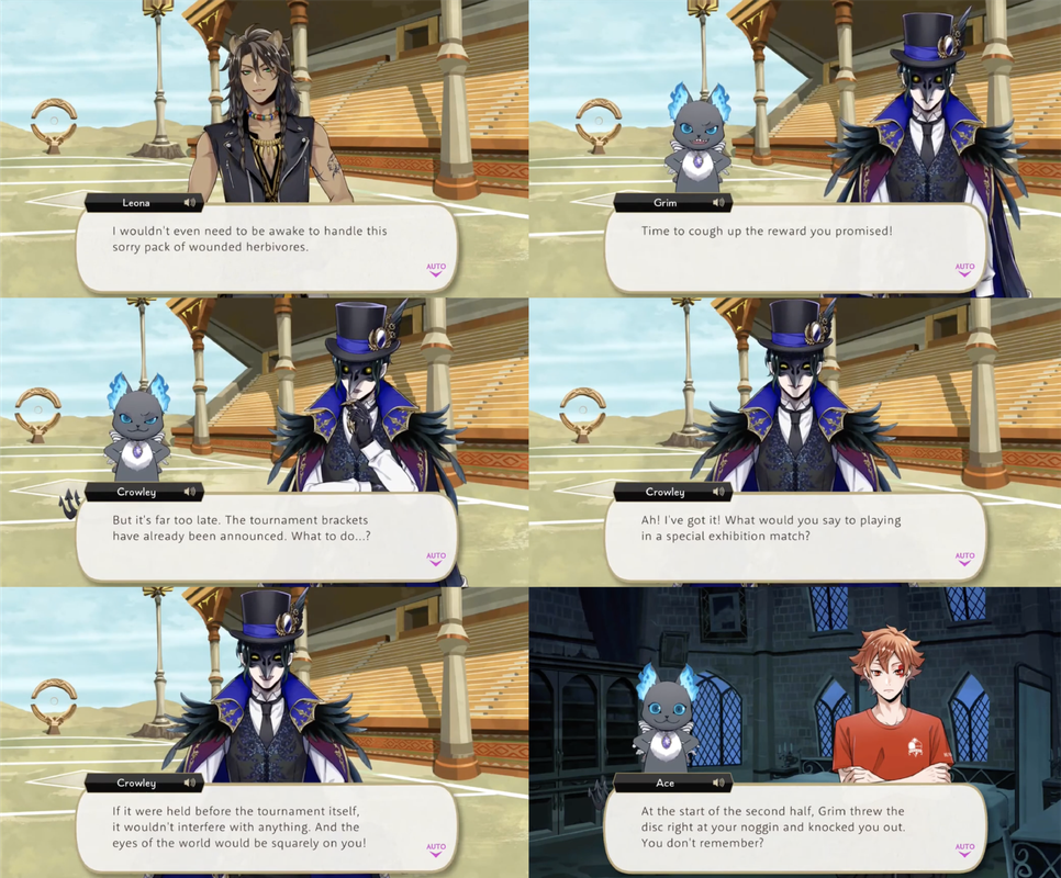 Leona agrees. Crowley rewards Grim with an exhibition match during which the prefect is knocked unconscious so they do not see Diasomnia Dorm win the competition.