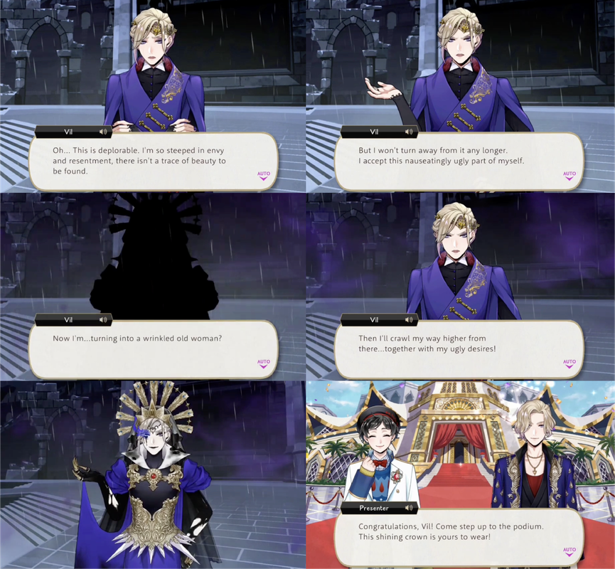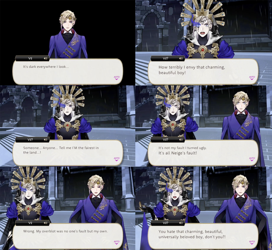Vil says that his overblot was no one’s fault but his own, and when the darkness insists that he hates Neige Vil reflects on how he is so steeped in envy and resentment there is no beauty to be found, but he refuses to turn away from it and will accept it as part of himself.