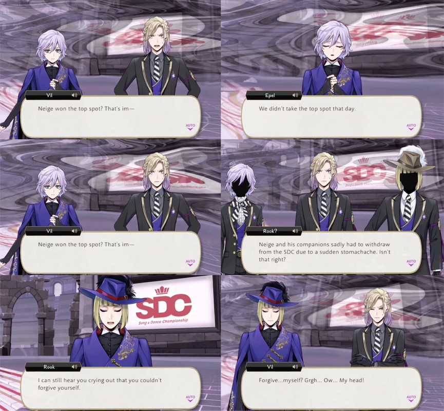 The darkness assures Vil that Neige had to withdraw due to a stomachache and their hard work has been rewarded, but Rook reminds him of how he said he would never forgive himself for trying to poison Neige. Rooks reminds him of his sacrifice in Book 6 and Vil awakens.