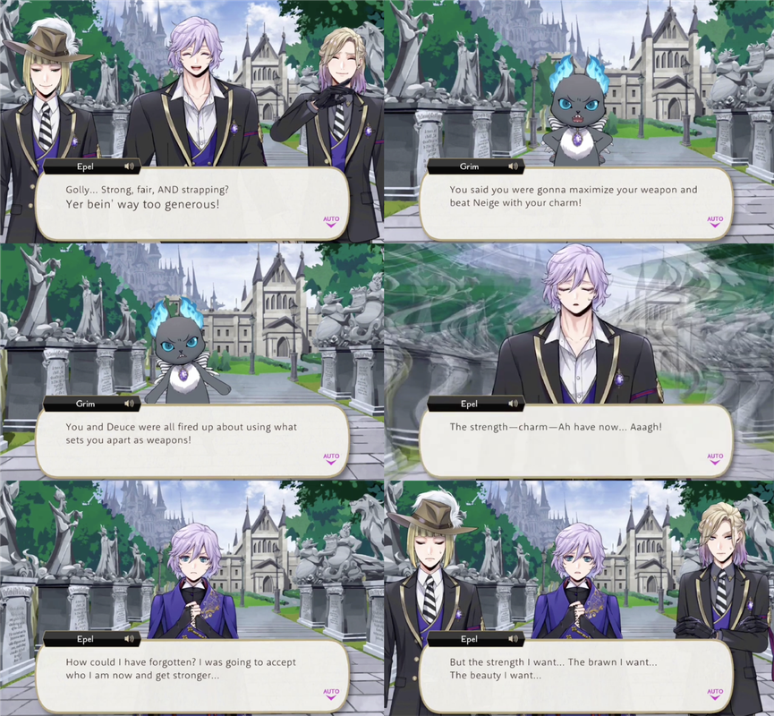They flatter Epel for his appearance and muscles and Grim reminds Epel of his promise from Book 5 to beat Neige with his charm and use what makes him unique, successfully awakening Epel.