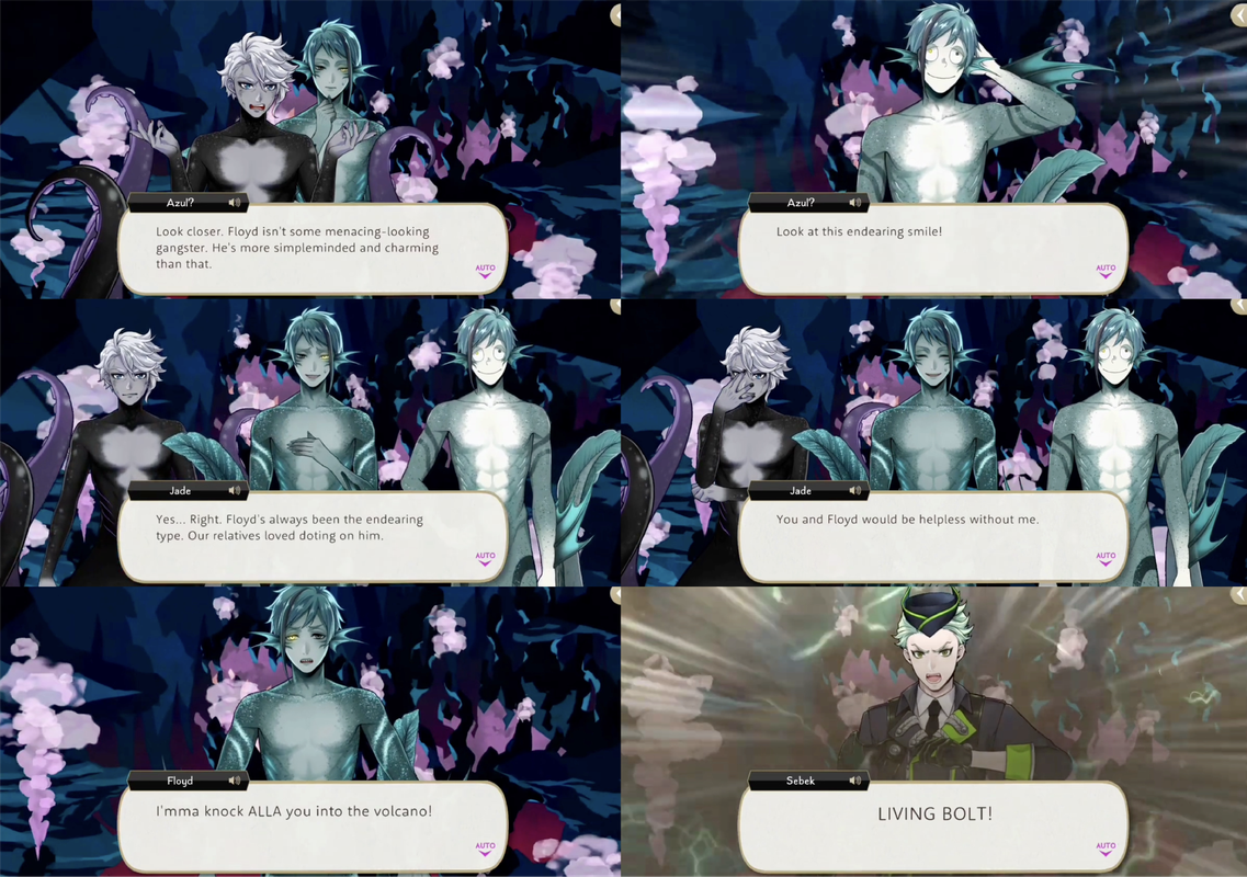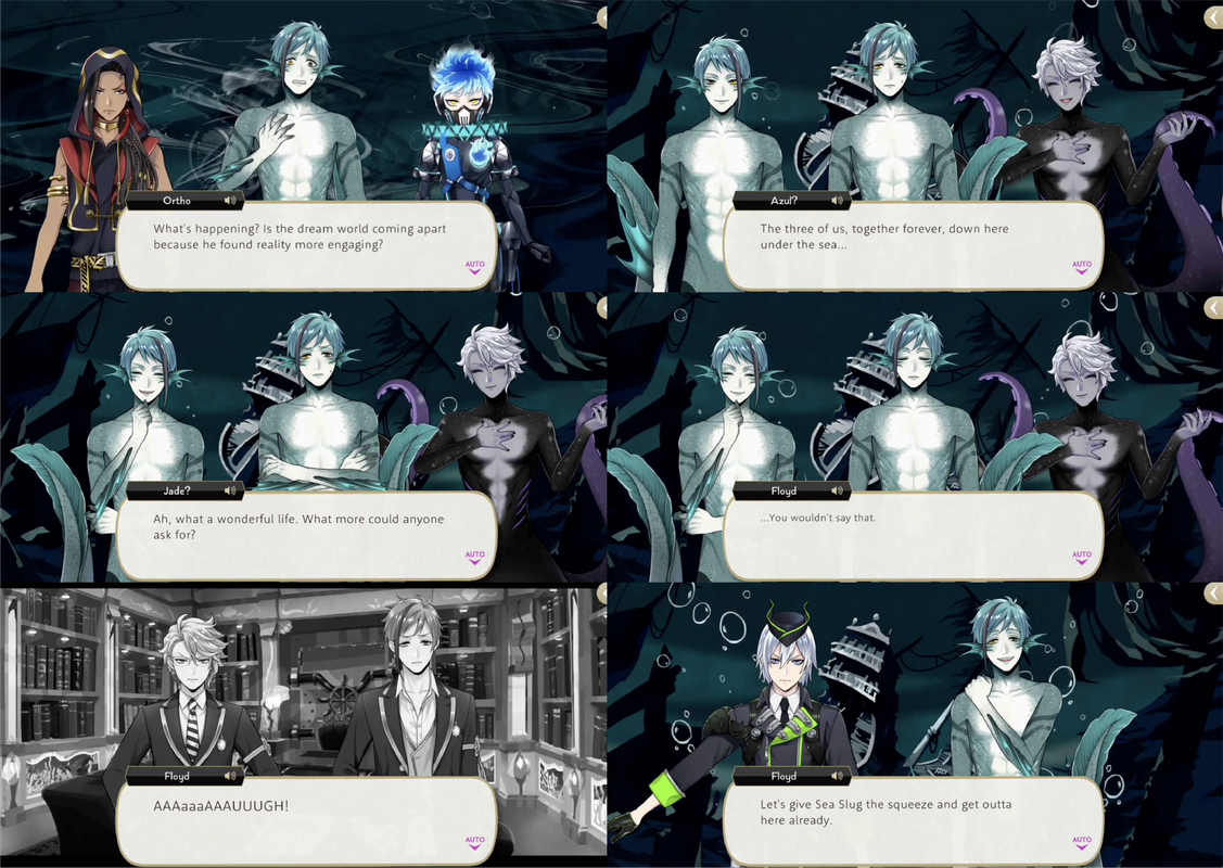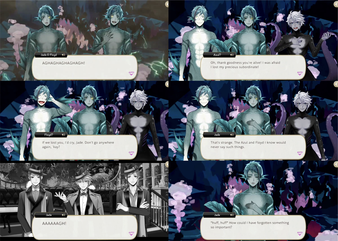 Jade and Floyd get rid of the dream versions of themselves and confront Azul with his contracts, reminding him of reality. They fight and Floyd deflects one of Azul’s attacks onto his own contracts, destroying them.