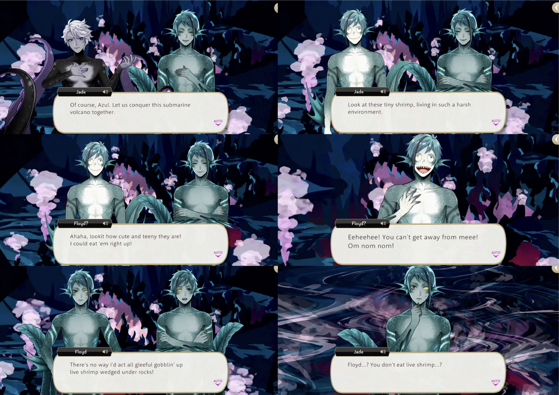 They move to Jade’s dream where Jade is visiting an underwater volcano with Azul and Floyd. Floyd says that he doesn’t eat live shrimp, nearing awakening Jade, but dream-Floyd and dream-Azul say convince him to stay asleep and Jade agrees, saying they would be helpless without him.