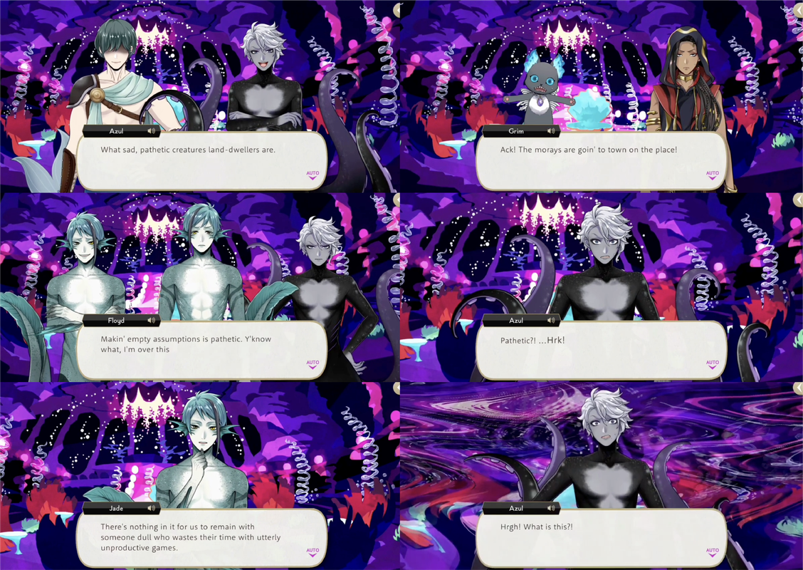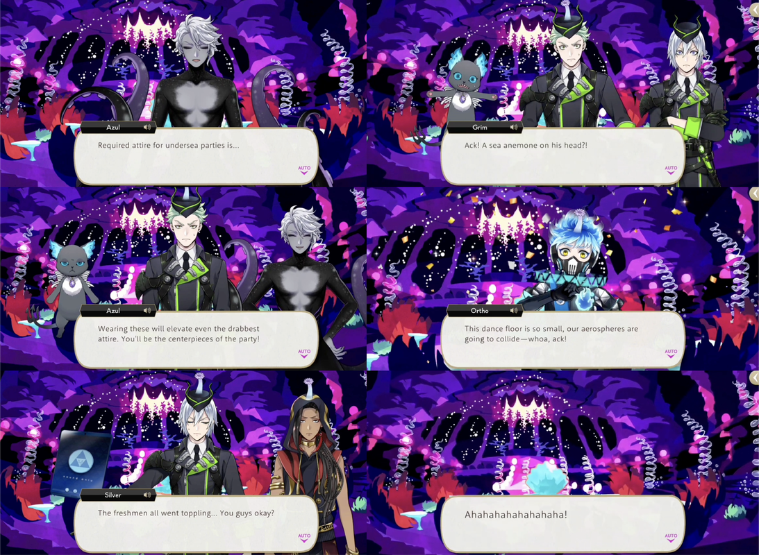 Azul invites the group to a party and humiliates them by having them wear anemones on their heads and laughing when they fall over one another while dancing.
