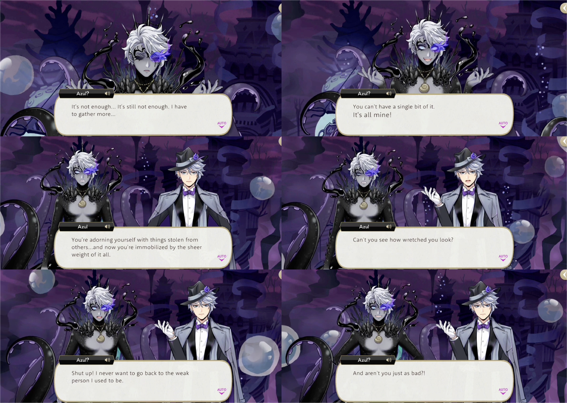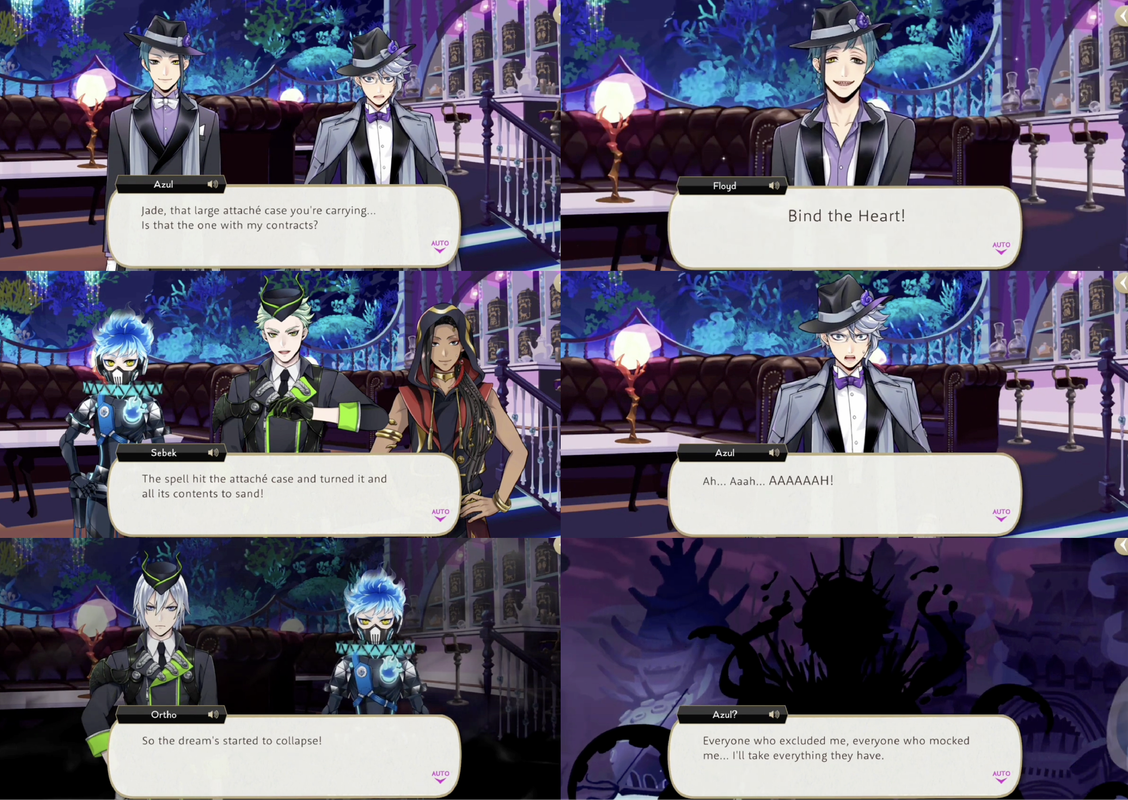 The dream breaks down as Azul’s happy ending is compromised and Azul is met with the overblotted version of himself, vowing to take everything away from everyone who bullied him. Azul observes that the darkness-Azul has become immobilized by the weight of the things he has stolen out of desperation to not return to how weak he used to be, but admits that they are the same and he, too, is vain and in denial of who he really is.