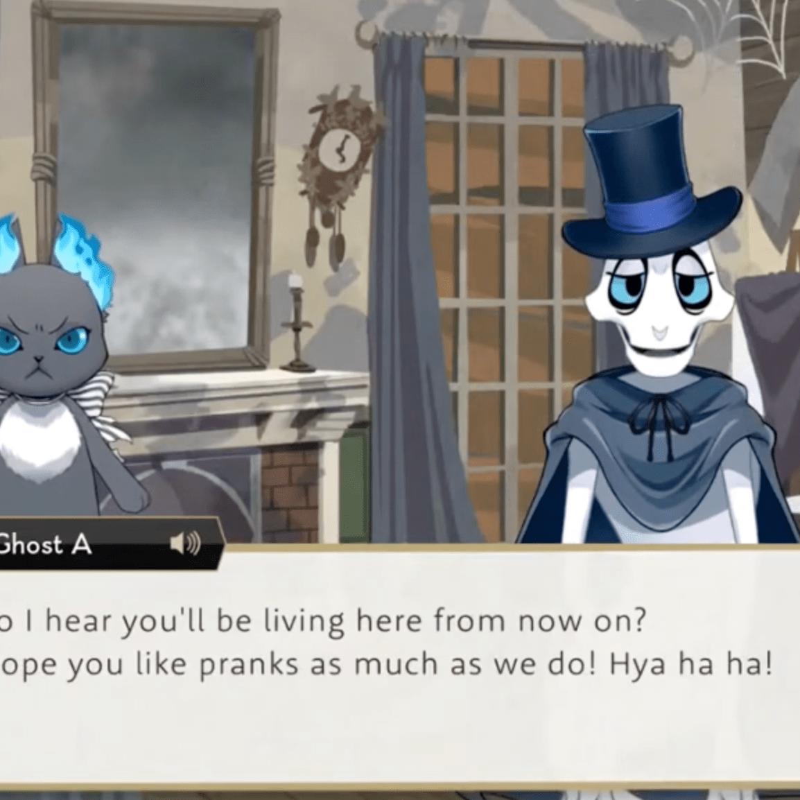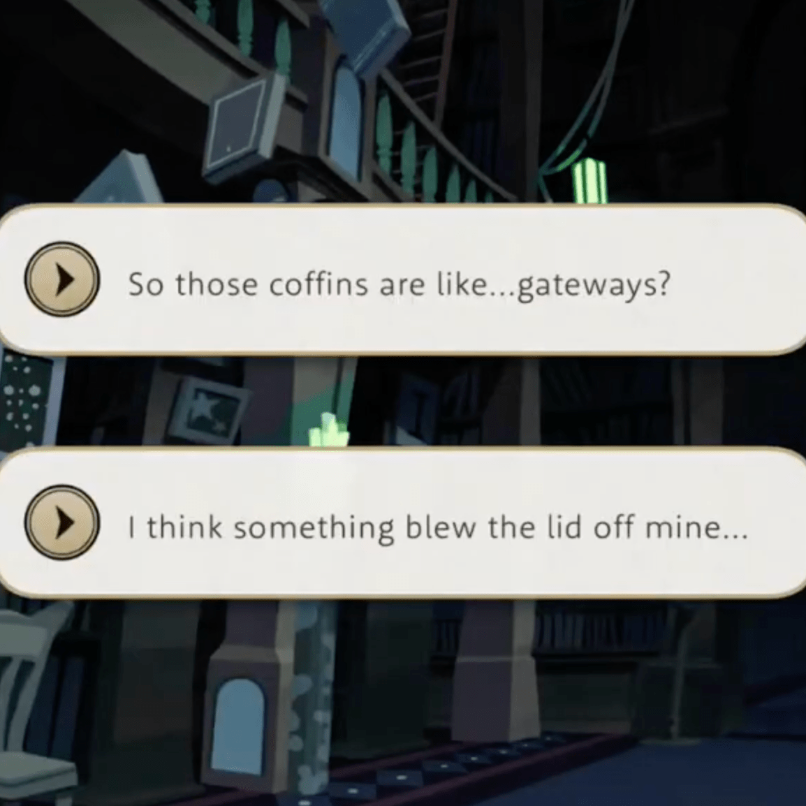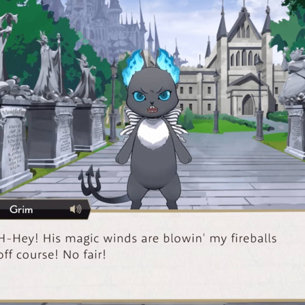 The player character is in a coffin, awoken by the fire-breathing Grim demanding their clothes so he can enroll at a school.