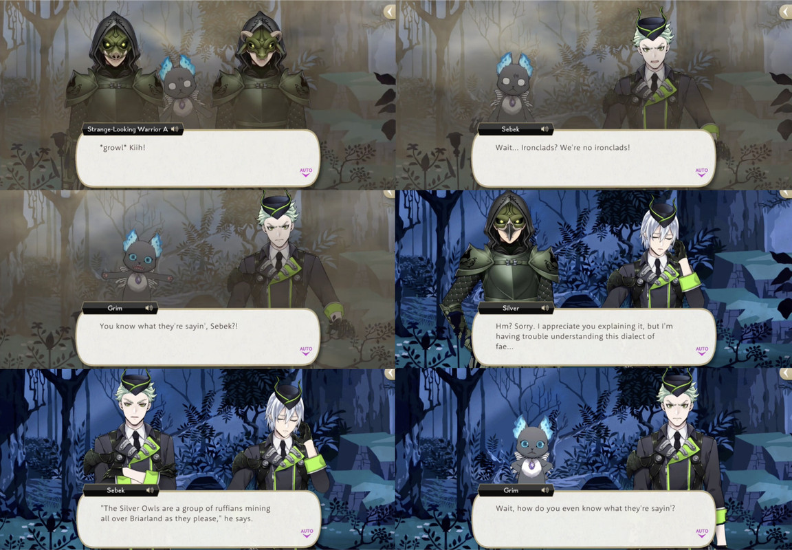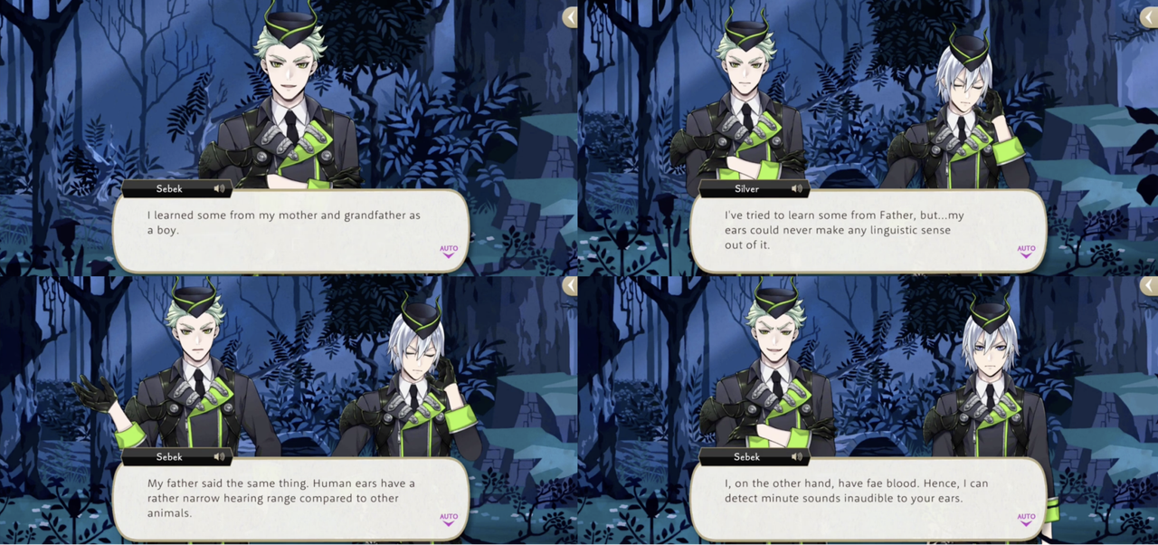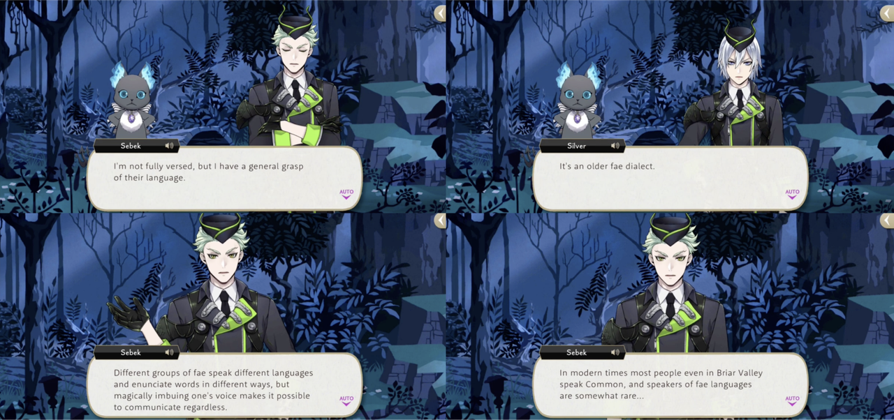 During Lilia’s dream we learn that Sebek is possibly bilingual: though we never see him speak the same language as the guardsmen (“an older fae dialect”) he says that, while not fully versed, he has a general grasp of their language.
