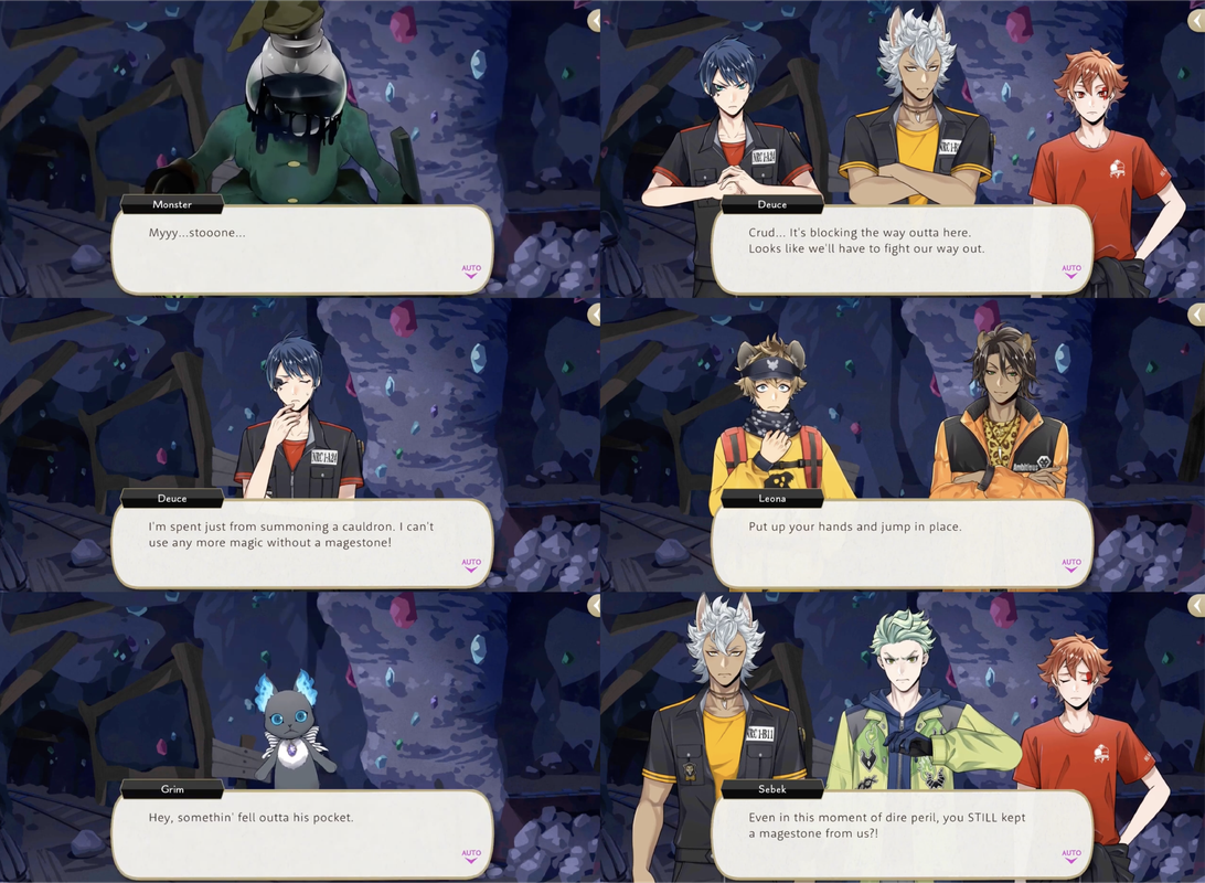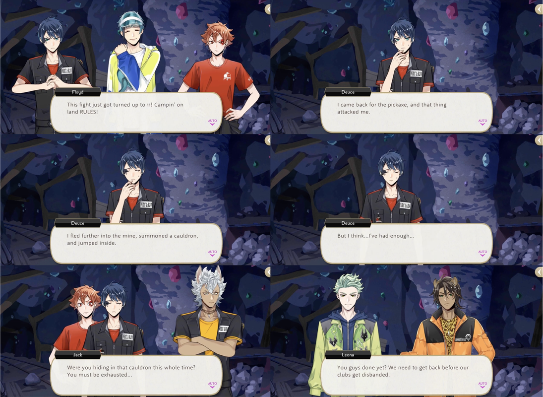 Leona decides to take a nap and Deuce returns alone to the mine after looking for mage stones in order to fetch a pickaxe that he forgot.