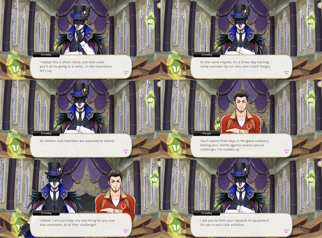 Crowley and Vargas announce a three-day training camp in the mountains for all athletic clubs members, where the students must complete various challenges for the chance to win new club equipment, with any club that fails to complete all challenges to be disbanded.