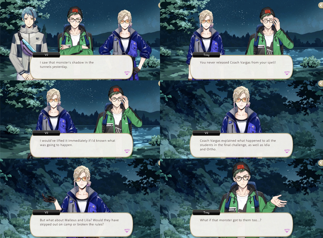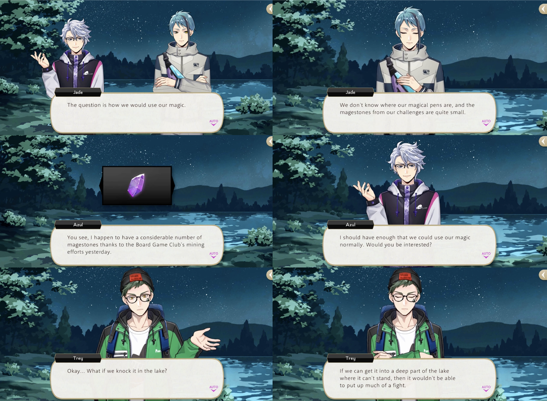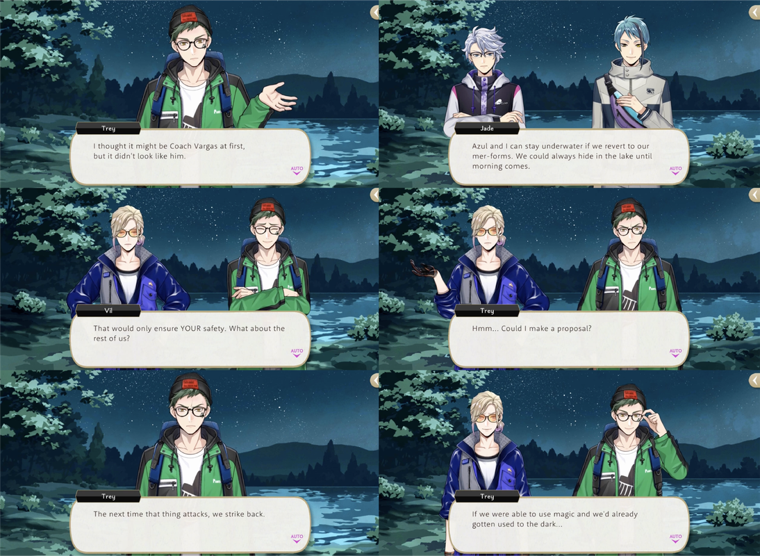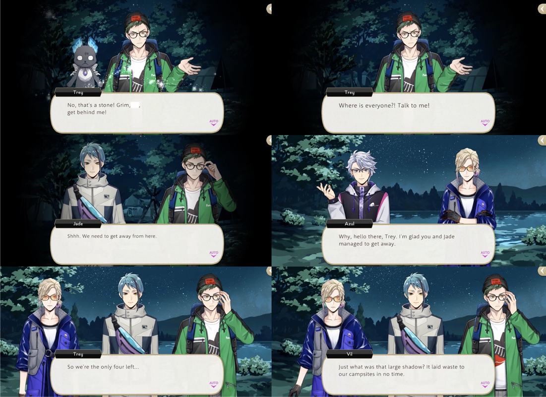 Suddenly the fire goes out and something unseen begins to attack with stones, scattering the students who disappear in the darkness until only Azul, Vil, Jade and Trey remain, regrouping at the lake.