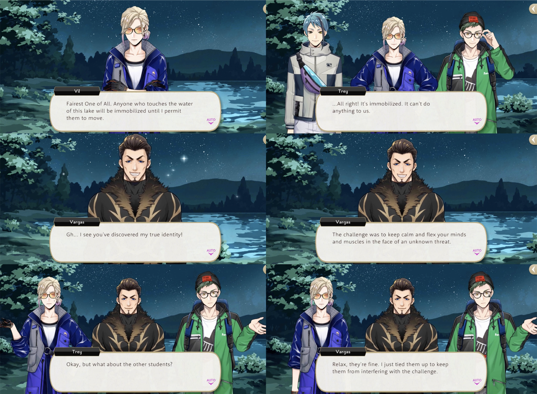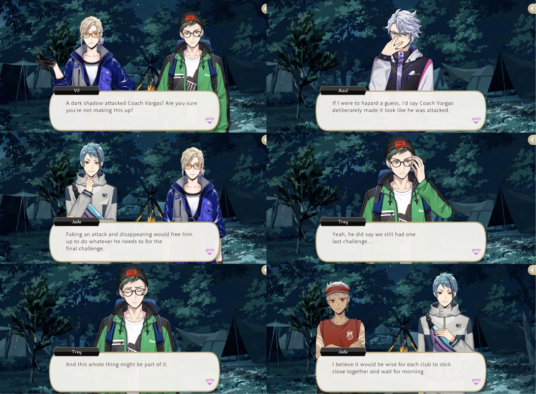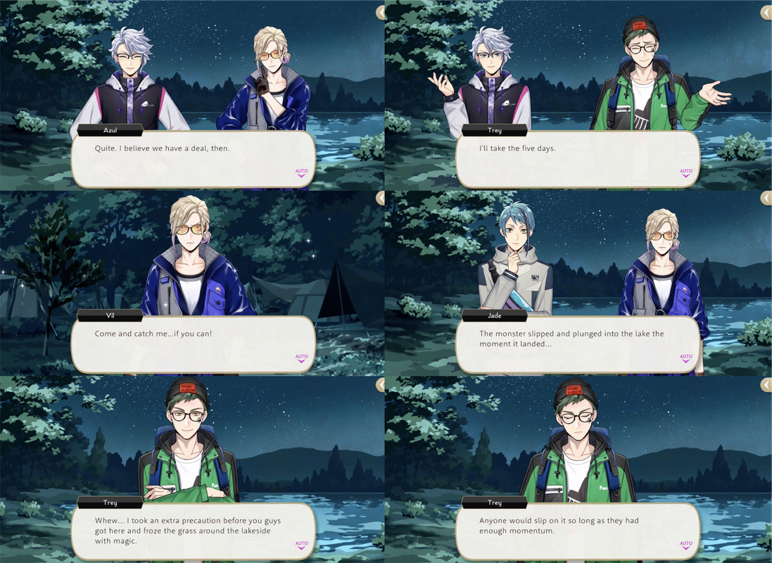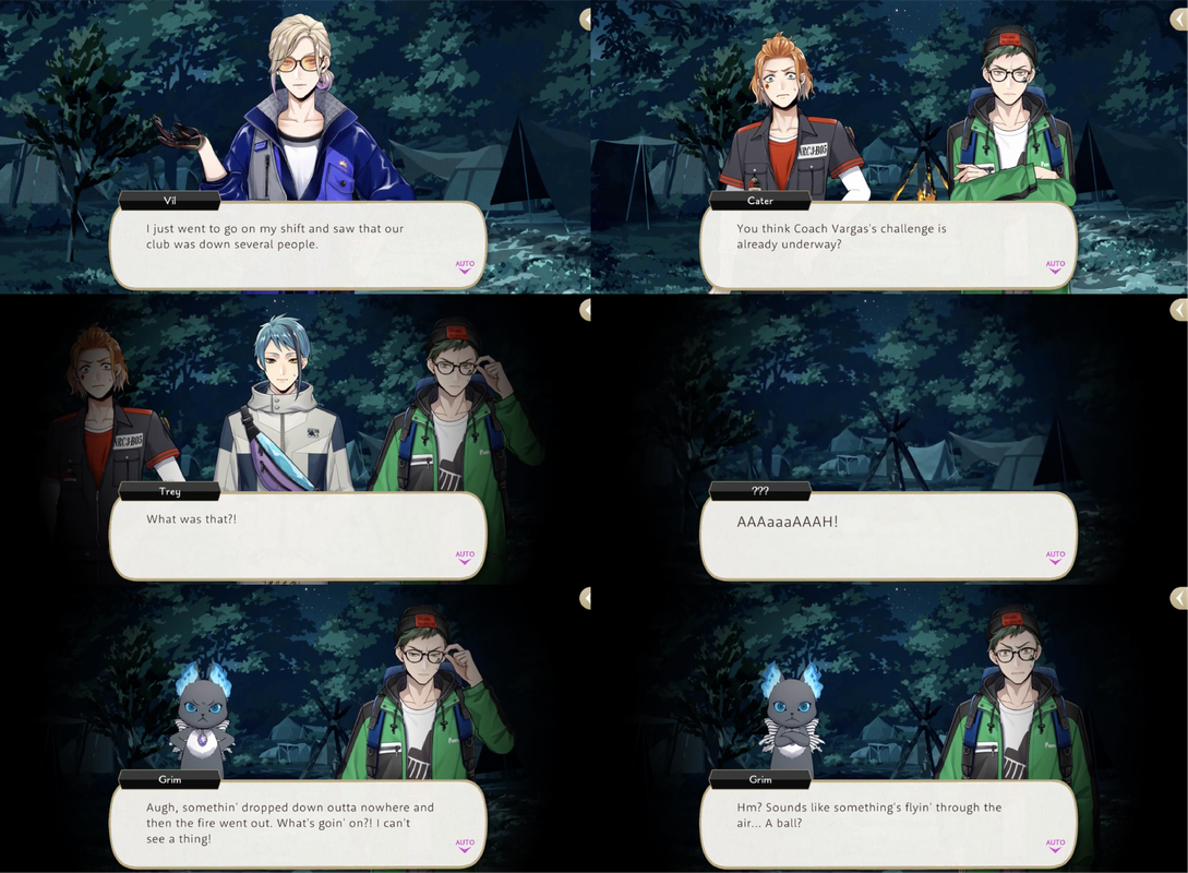 Suddenly the fire goes out and something unseen begins to attack with stones, scattering the students who disappear in the darkness until only Azul, Vil, Jade and Trey remain, regrouping at the lake.