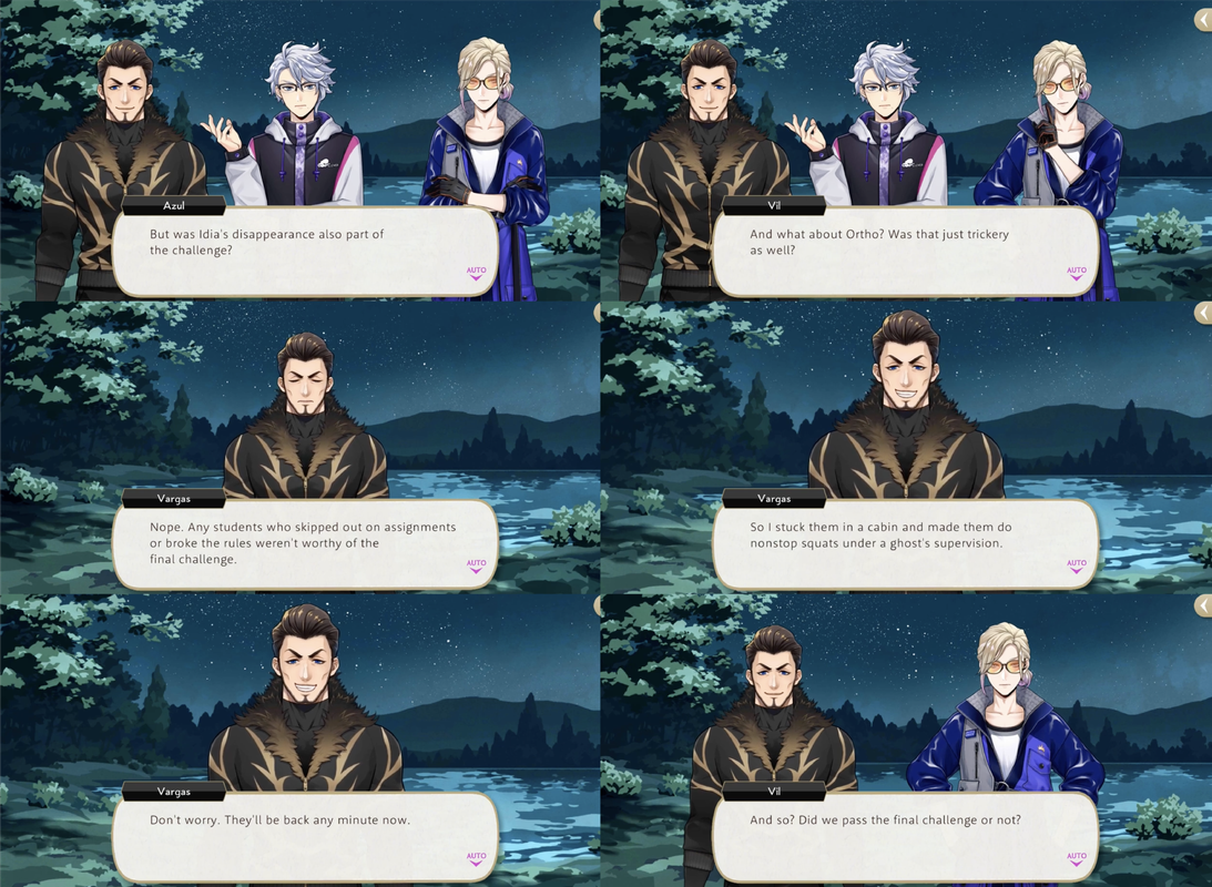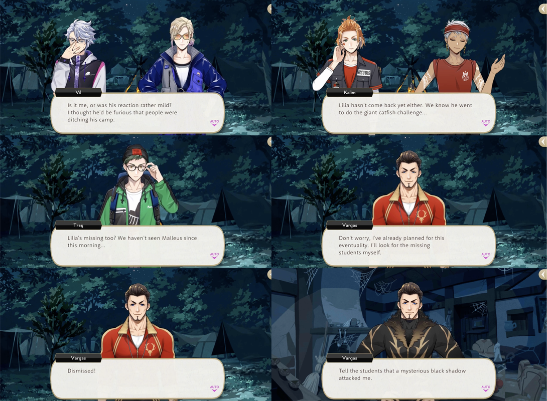 That night Azul and Vil report the missing Idia and Ortho to Vargas and Kalim and Trey report the missing Malleus and Lilia, but Vargas is not worried.