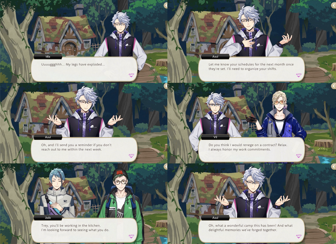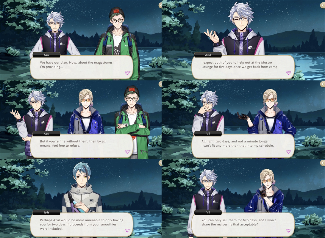 At the conclusion of the event, Azul reminds Vil and Trey of their promise to work at Mostro Lounge.