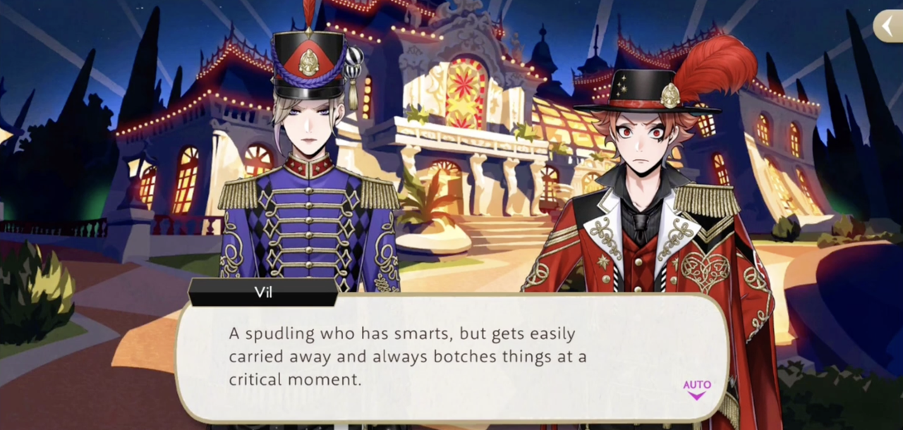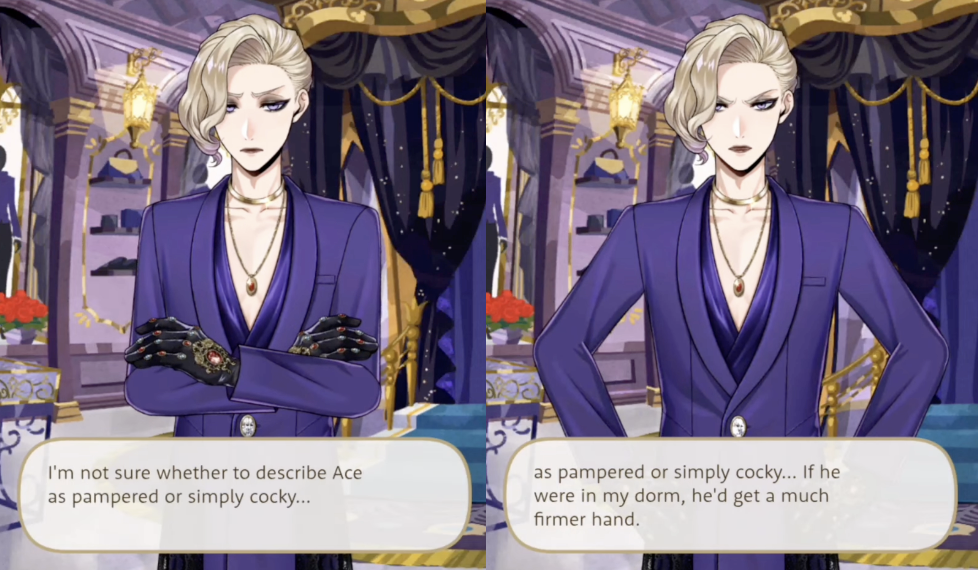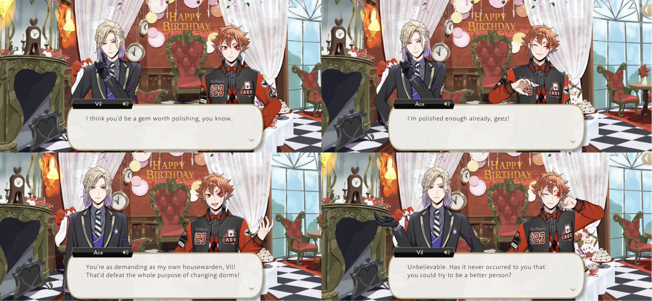 Vil is Ace’s second birthday interviewer and tells him he would be a gem worth polishing. When Ace says he wouldn’t want to transfer into Pomefiore because Vil is as demanding as Riddle, which would defeat the purpose of changing dorms at all, Vil responds, “Has it never occurred to you that you could try to be a better person?”