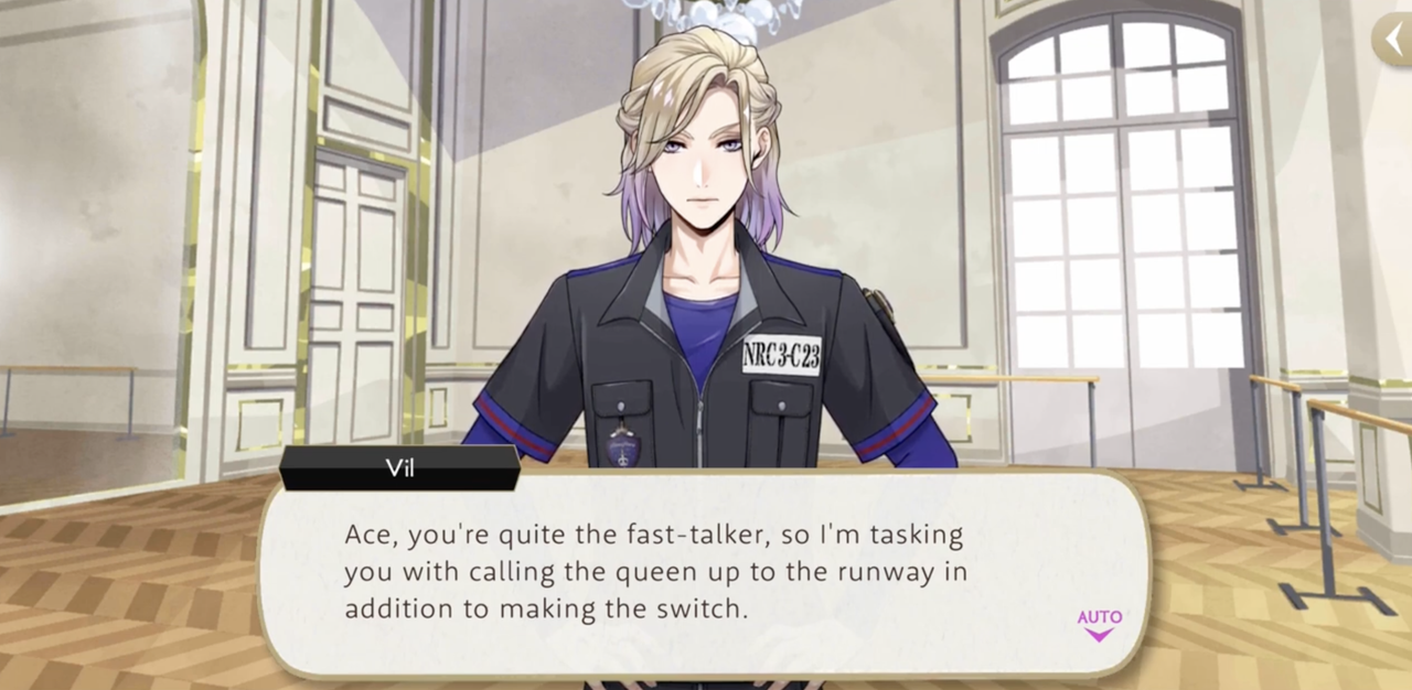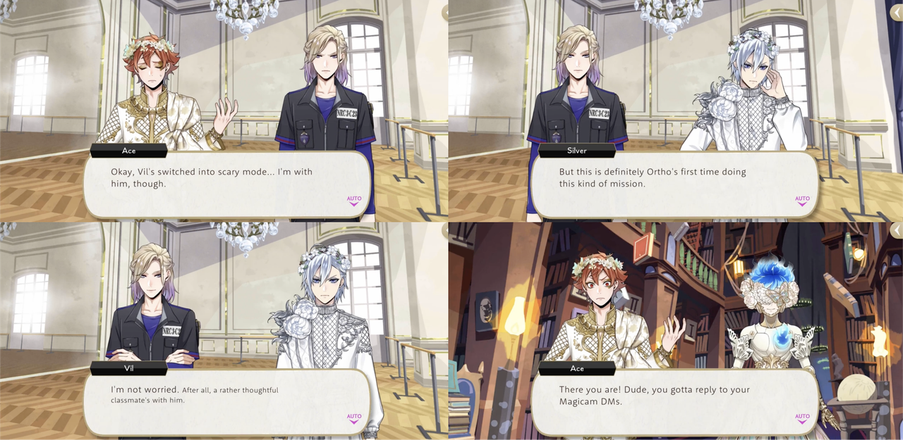 Ace comments on Vil switching “into scary mode” during Fairy Gala IF, but when Ortho begins to struggle with his assignment and Silver expresses concert, Vil says that he is not worried because Ortho is with “a rather thoughtful classmate,” who is revealed to be Ace.