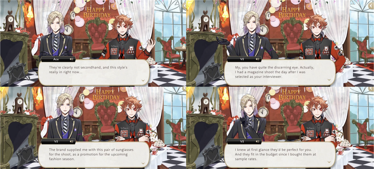 Vil’s birthday gift for Ace is a pair of sunglasses from a high-end brand (gold frames with brown lenses) that Vil was able to fit into the school’s budget by buying them at sample rates after being supplied a pair for a magazine shoot.