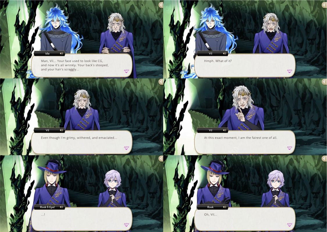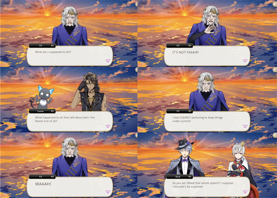At the end of Book 6 Vil declares “Even though I’m grimy, withered, and emaciated…at this exact moment, I am the fairest one of all,” later saying the was “CLEARLY posturing to keep things under control.” (Azul: “So you ad-libbed that whole speech? I suppose I shouldn’t be surprised.”)