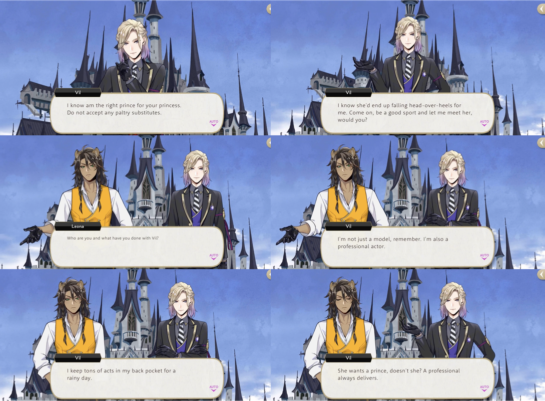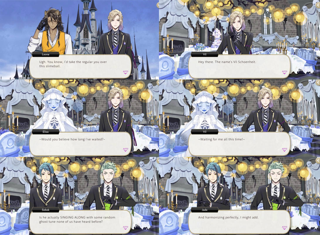 We have seen a few examples of Vil’s acting in the game: he says he “keeps tons of acts in (his) back pocket for a rainy day,” one of which he uses in an attempt to seduce Eliza. “She wants a prince, doesn’t she? A professional always delivers.” (Leona: “You know, l’d take the regular you over this slimeball.”)