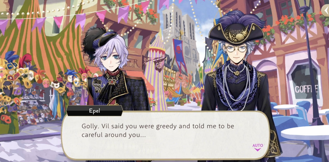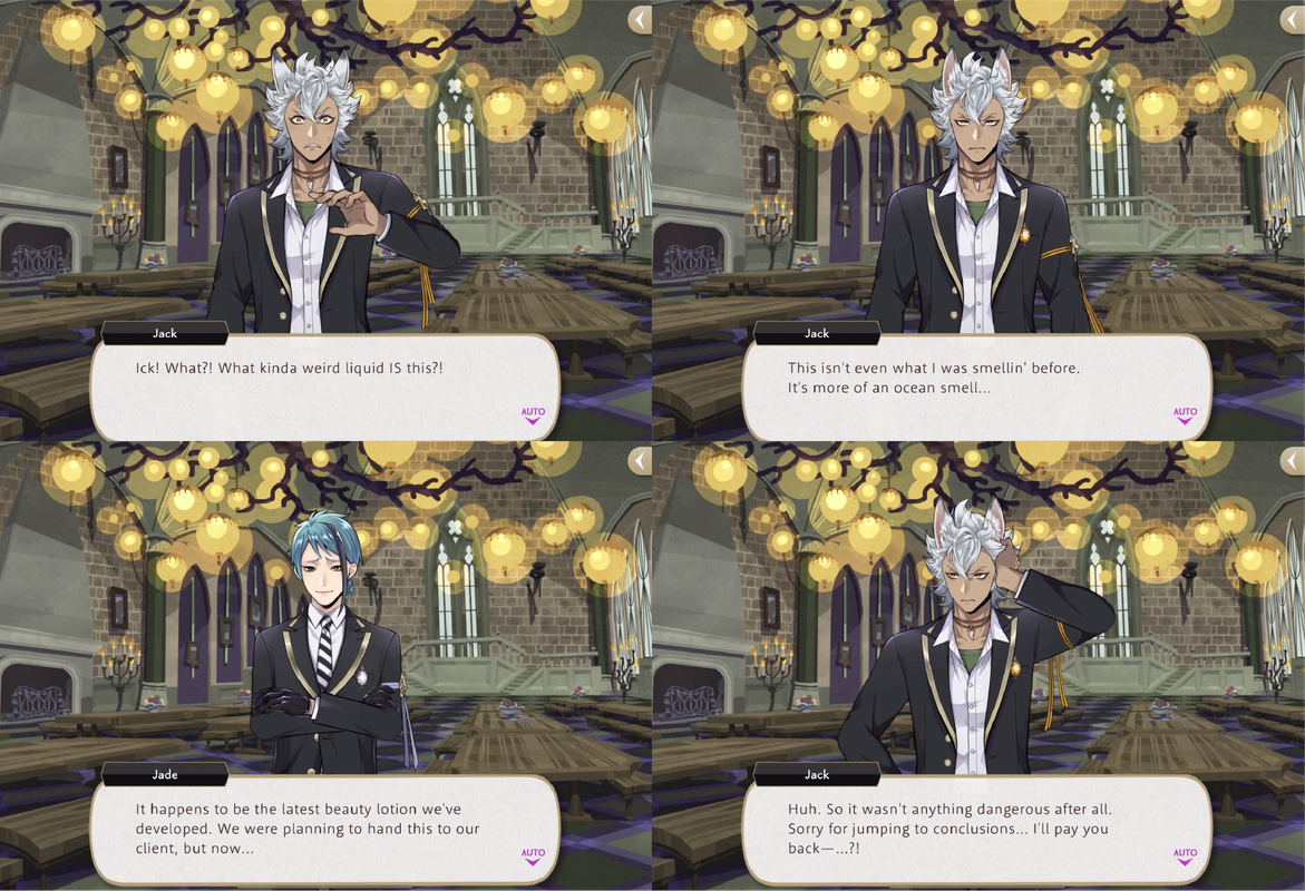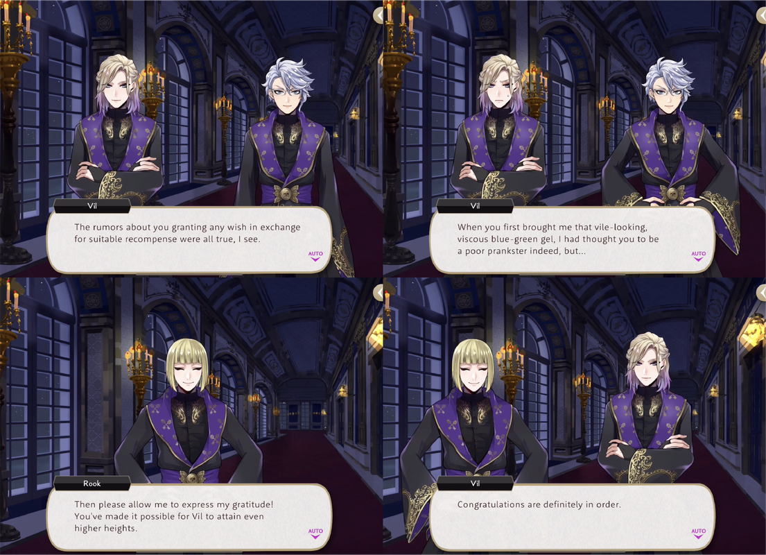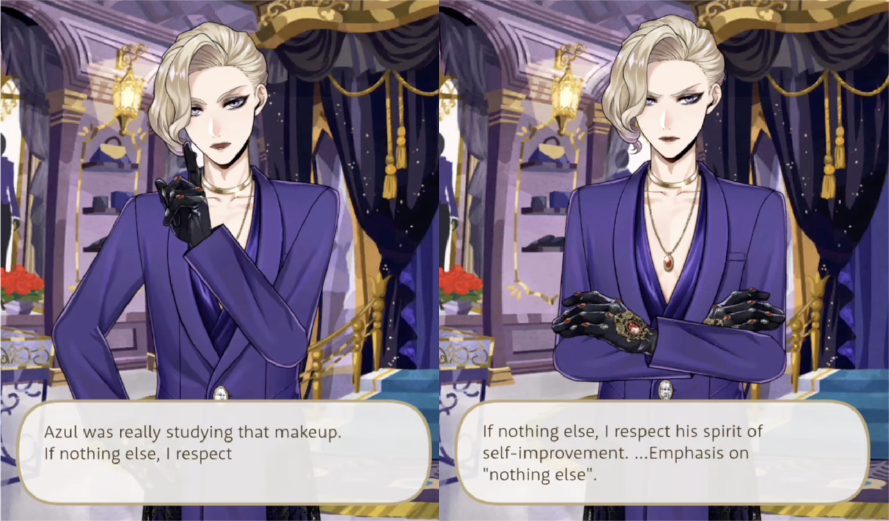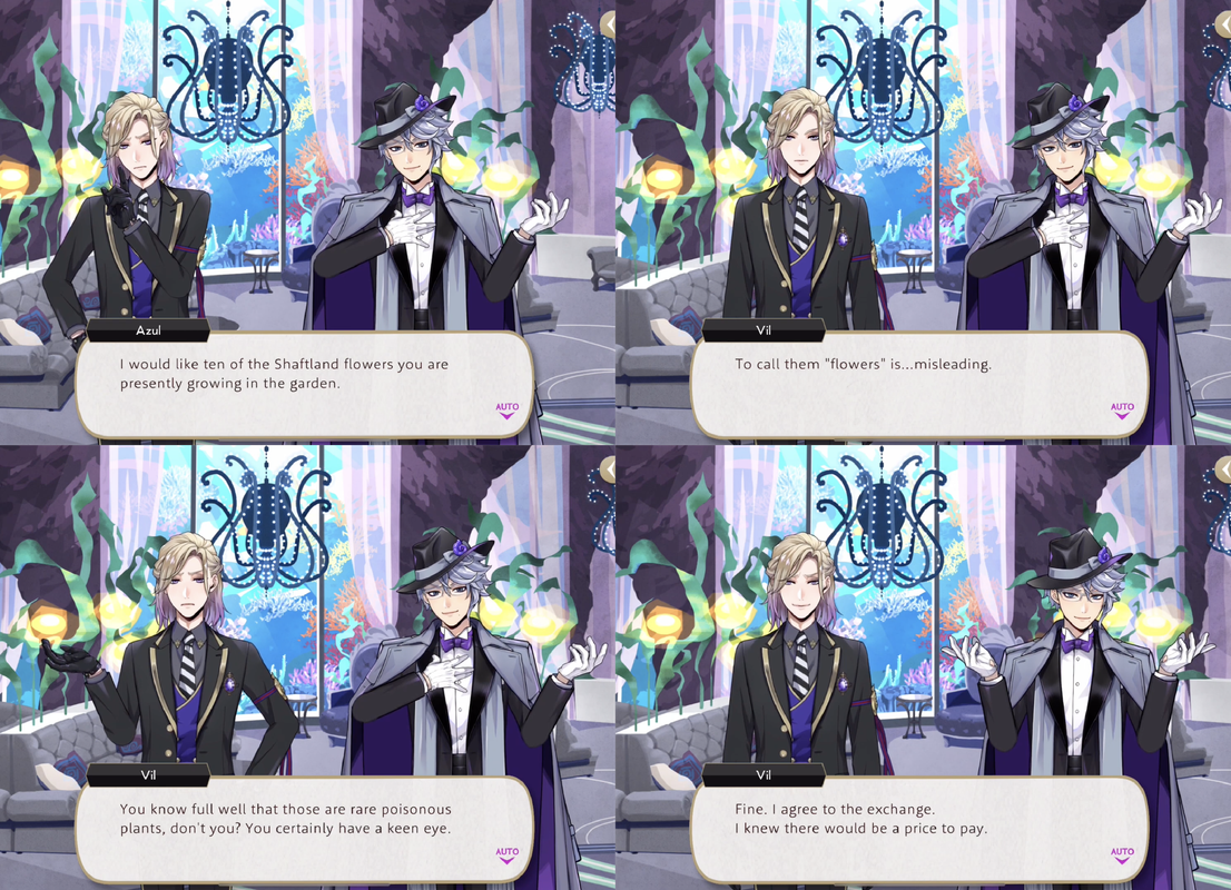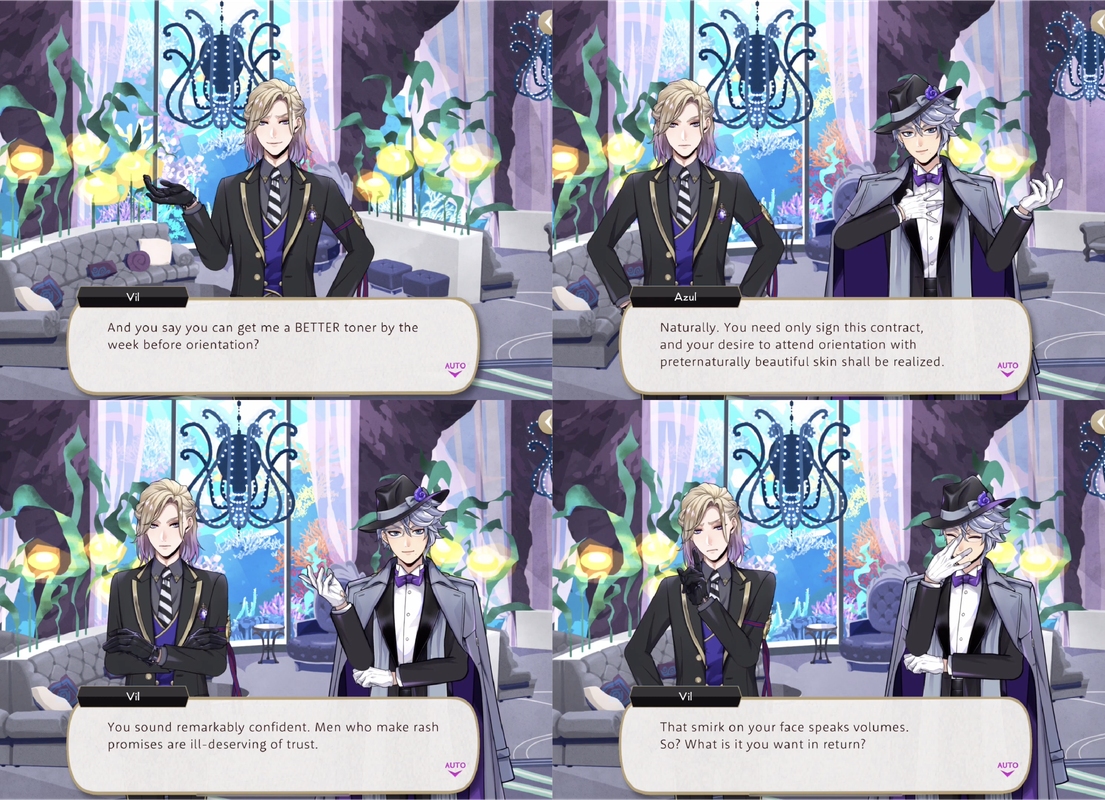 Vil and Azul also overlap in Azul’s ceremonial robes vignette, where Azul promises Vil that he can create a better toner for Vil than the one he has crafted by himself. Vil observes, “You sound remarkably confident. Men who make rash promises are ill-deserving of trust.”