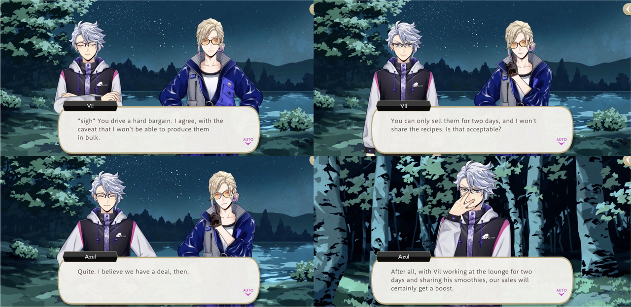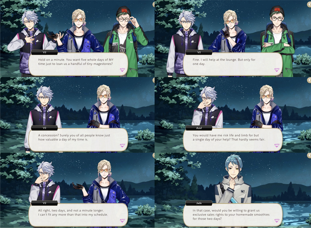 The terms are revealed to be Vil and Trey assisting at Mostro Lounge for five days, which Vil refuses (“Surely you of all people know just how valuable a day of my time is”), negotiating down to two days and agreeing to Jade’s suggestion that he grants the lounge exclusive sales rights to his homemade smoothies for the duration.