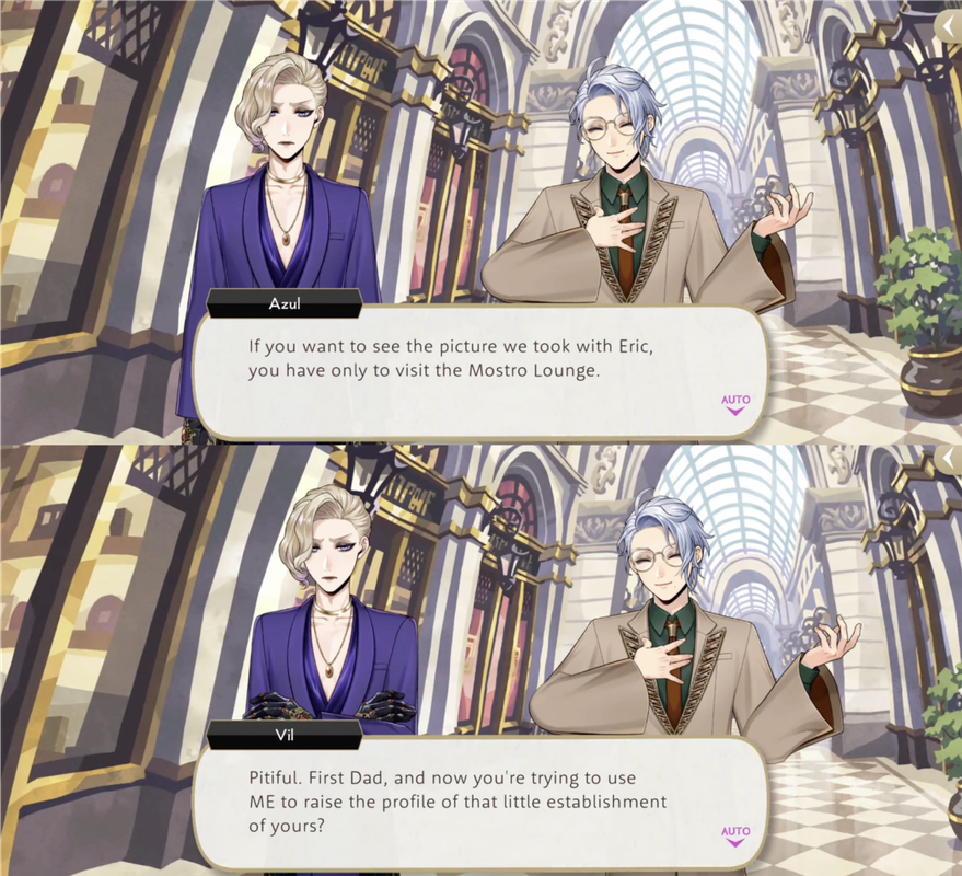 When Azul expresses interest in displaying a picture that the red carpet group took in the Fairest City at Mostro Lounge Vil responds, “Pitiful. First Dad, and now you’re trying to use ME to raise the profile of that little establishment of yours?”