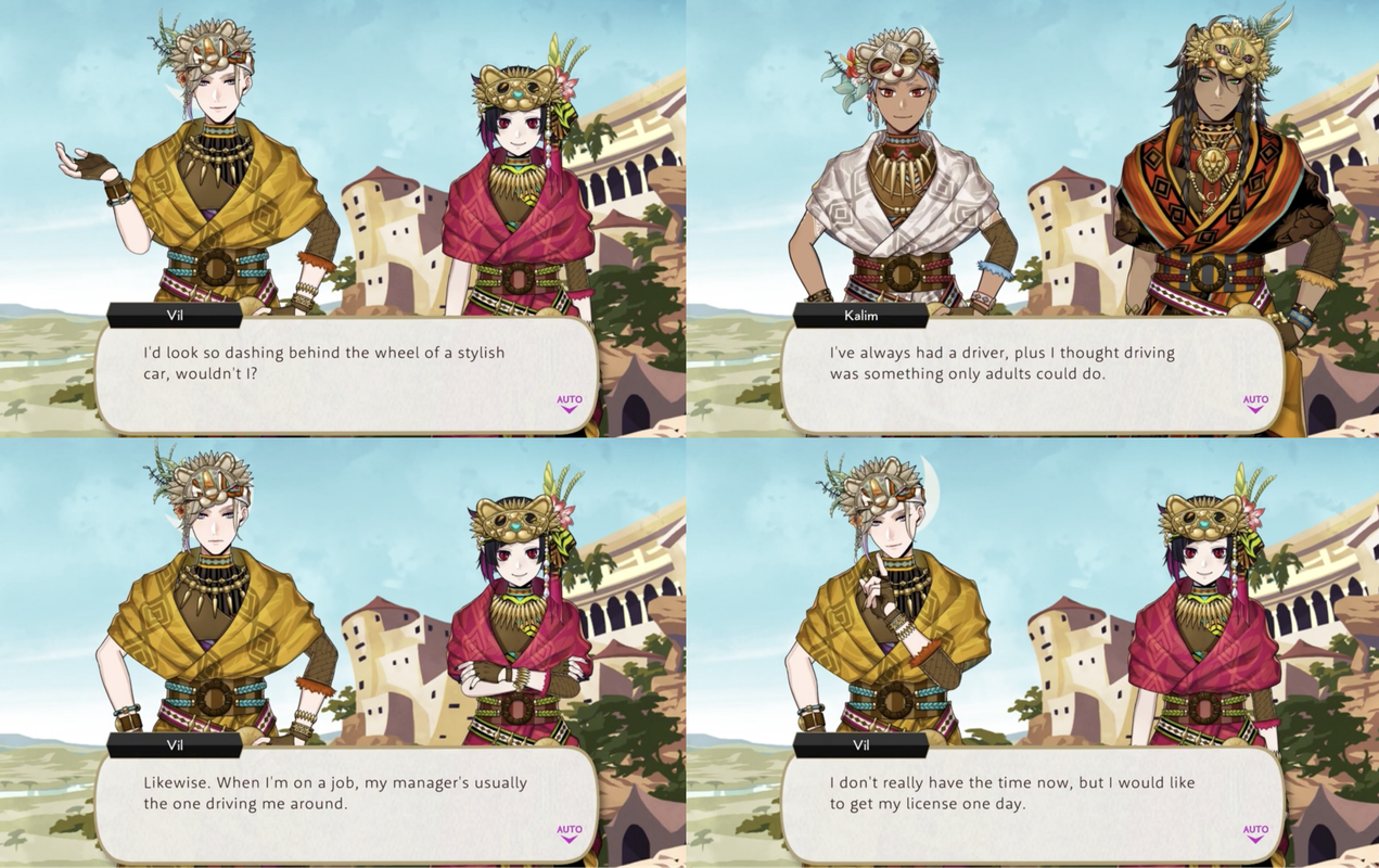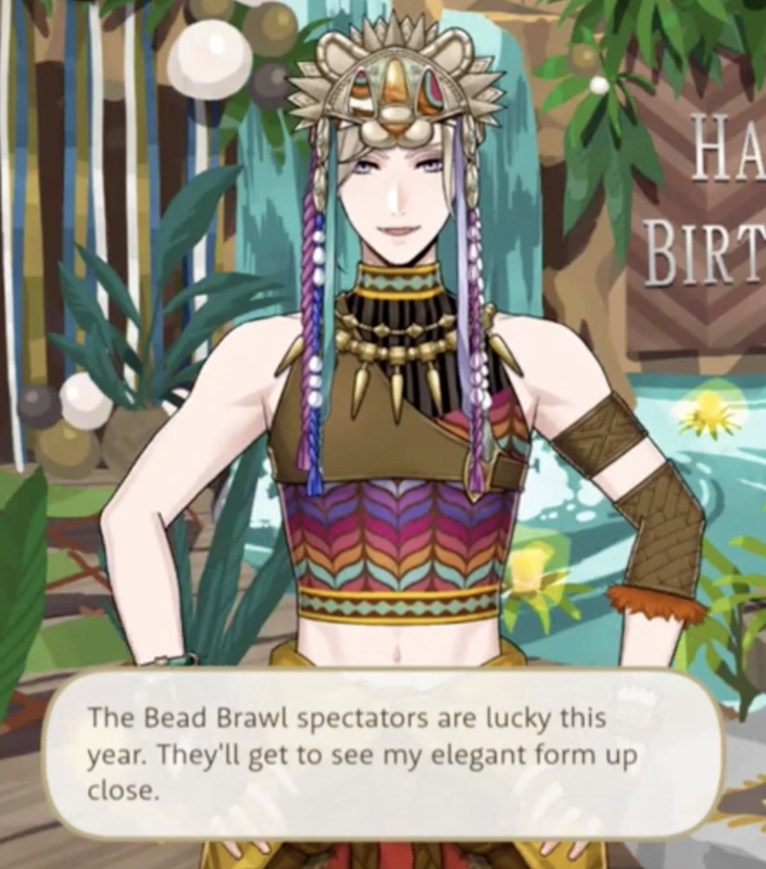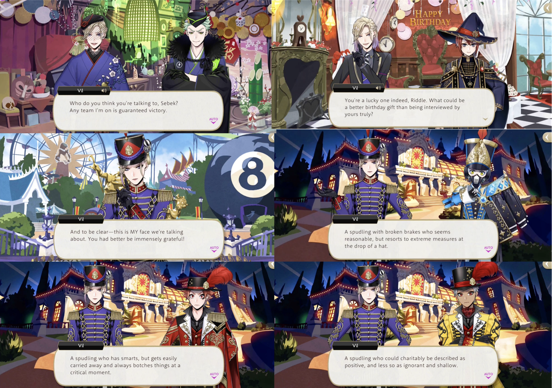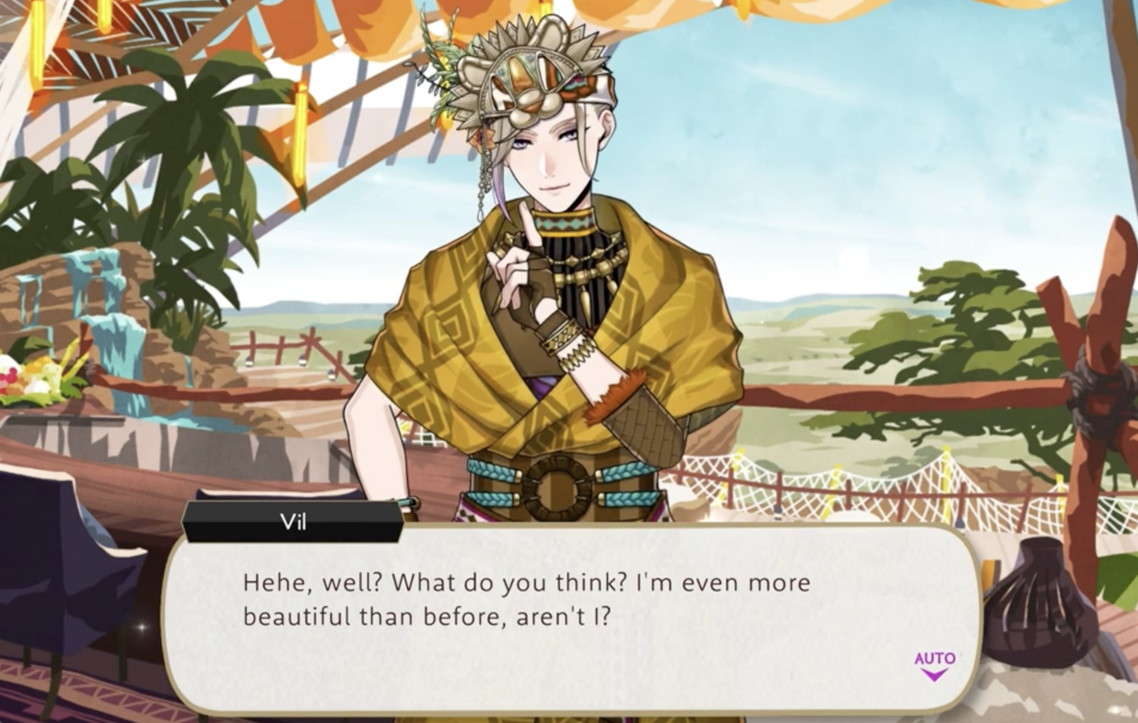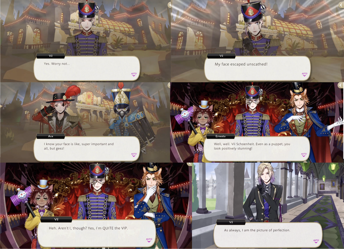 When Ortho convinces him to take a photo in a standee at Playfulland Vil responds, “this is MY face we’re talking about. You had better be immensely grateful!,” and there is an interaction between Vil, Ortho, Ace and Kalim where he describes them all as “such poor-quality spudlings, they couldn’t even make decent mashed potatoes to serve with steak” (and himself as “a world-famous supermodel with overwhelming charisma”).