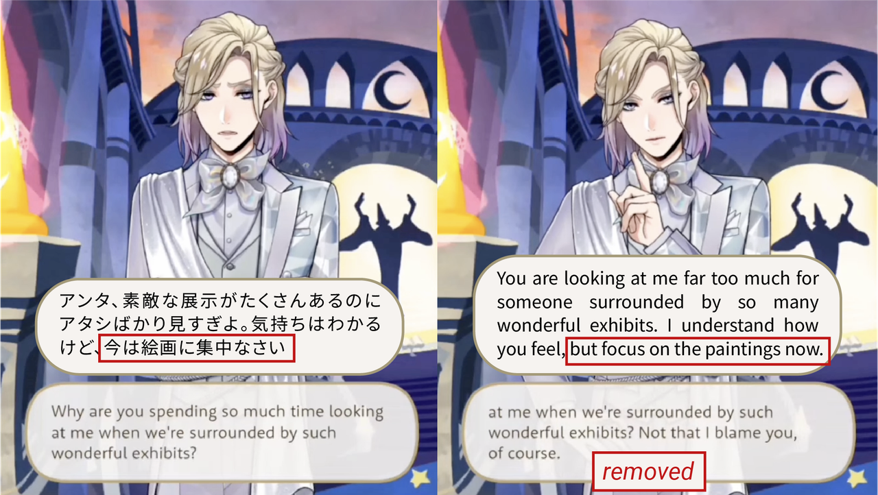 In a voice line where he encourages the prefect to pay attention to the exhibits at a museum rather than himself, the line “focus on the paintings now” was removed.