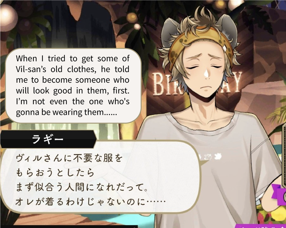 When Ruggie asks Vil for his old clothes, Vil tells him that he first must become someone who will look good wearing them (Ruggie had been intending to sell them).