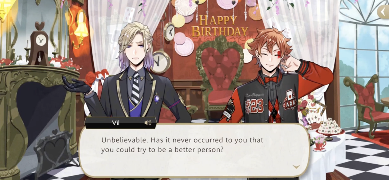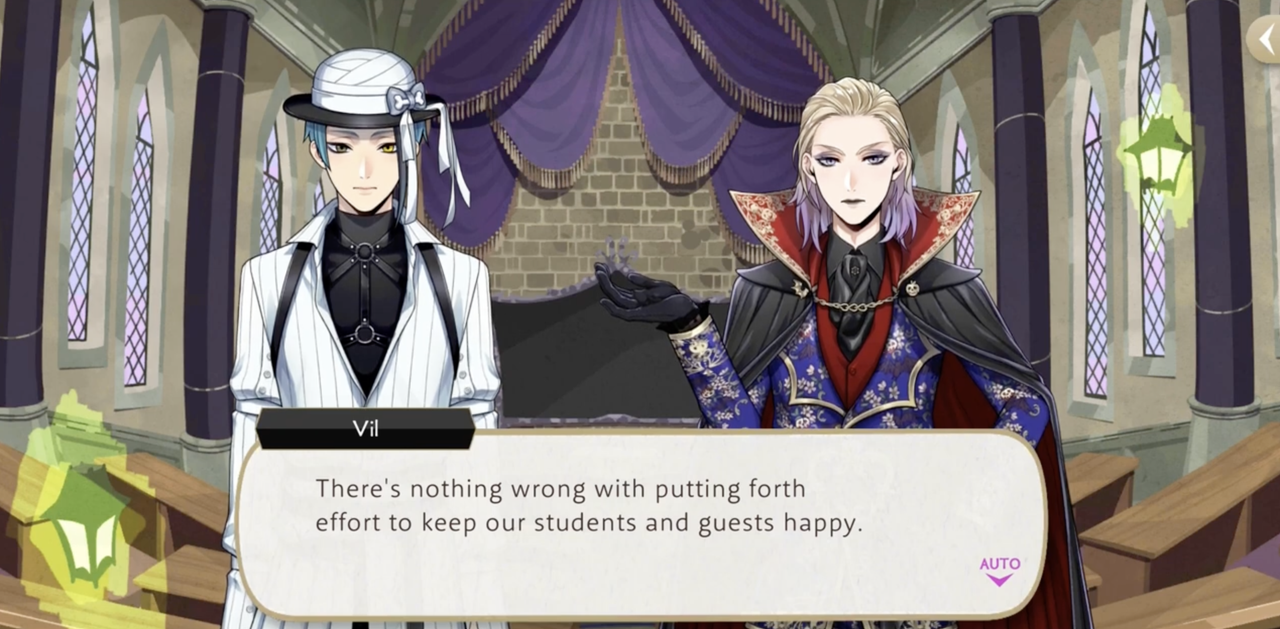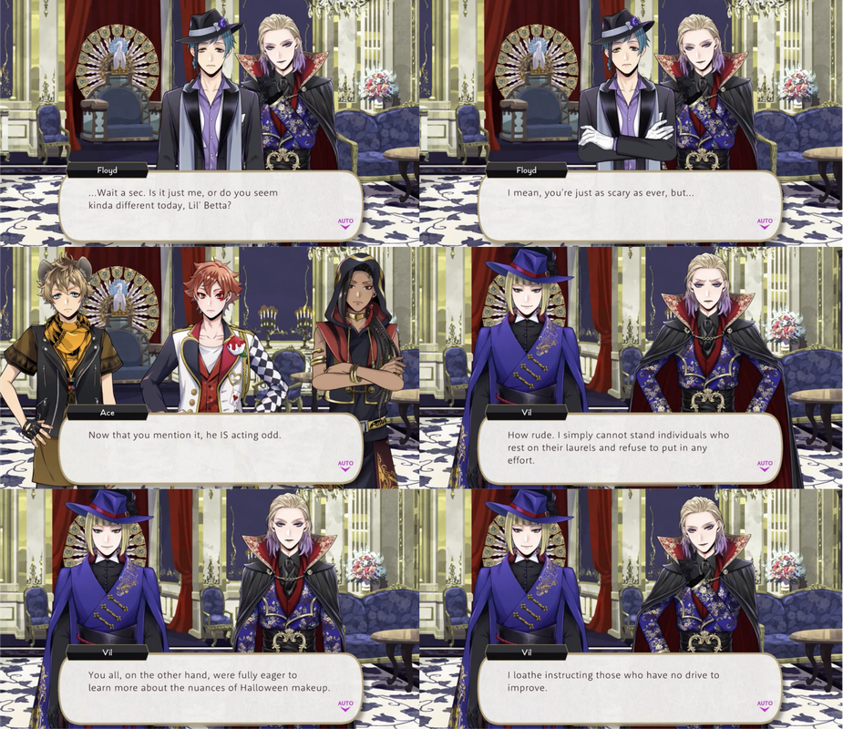 Floyd and Ace comment on Vil “acting odd” during his Halloween vignette and Vil responds, “How rude. I simply cannot stand individuals who rest on their laurels and refuse to put in any effort. You all, on the other hand, were fully eager to learn more about the nuances of Halloween makeup.”