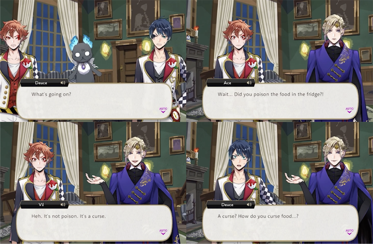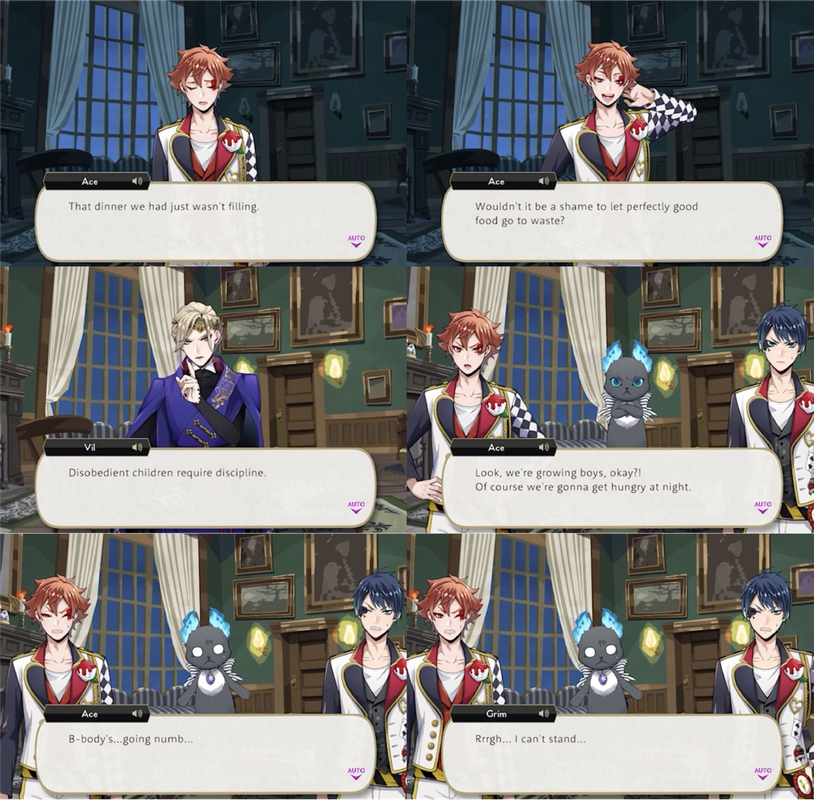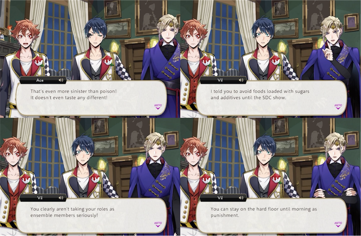 Vil punishes Ace, Deuce and Grim for late-night snacking during the VDC training camp, cursing their food to keep them immobile on the floor until morning.